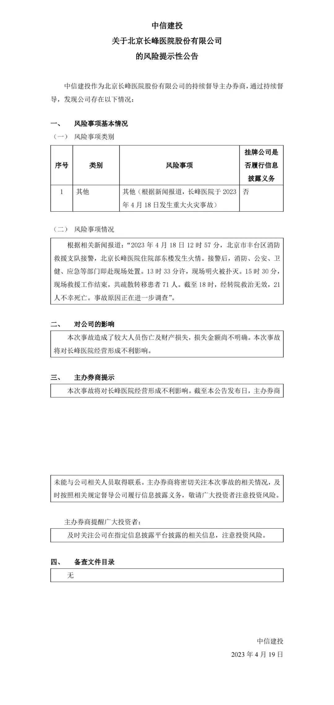 19日,北京長峰醫院股份有限公司的主辦券商中信建投發布公告稱,本次事故造成了較大人員傷亡及財產損失,損失金額尚不明確。本次事故將對長峰醫院經營形成不利影響。截至本公告發布日,主辦券商未能與公司相關人員取得聯繫。主辦券商將密切關注本次事故的相關情況,及時按照相關規定督導公司履行信息披露義務,敬請廣大投資者注意投資風險。