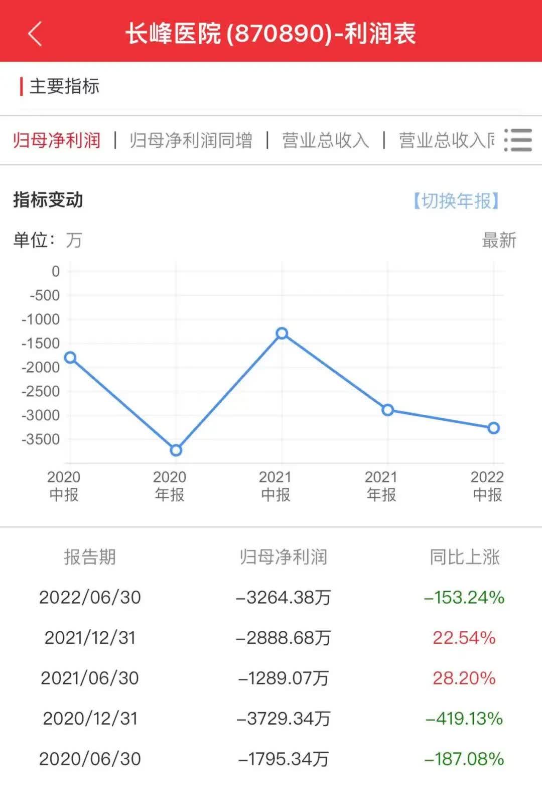 長峰醫院2022年半年度報告顯示,2022年上半年,北京長峰醫院實現營業收入約為2.53億元,對應實現歸屬凈利潤約為-3264.38萬元。