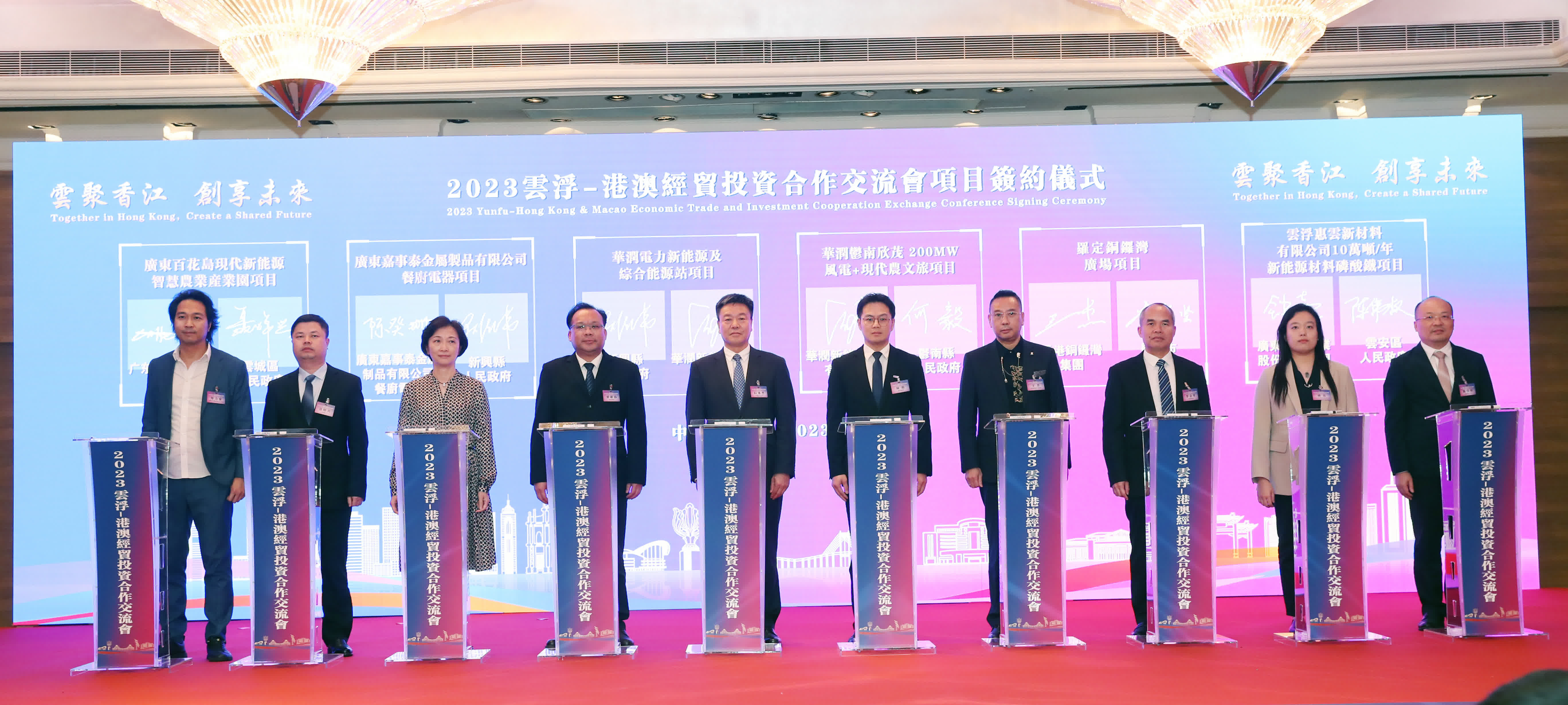 香港中華廠商聯合會、香港中華出入口商會、香港工商界各區聯合總會、香港創意產業及科技創新委員會、澳門建材企業商會、澳門大學中華醫藥研究院等分別與雲浮市有關單位簽訂合作框架協議。