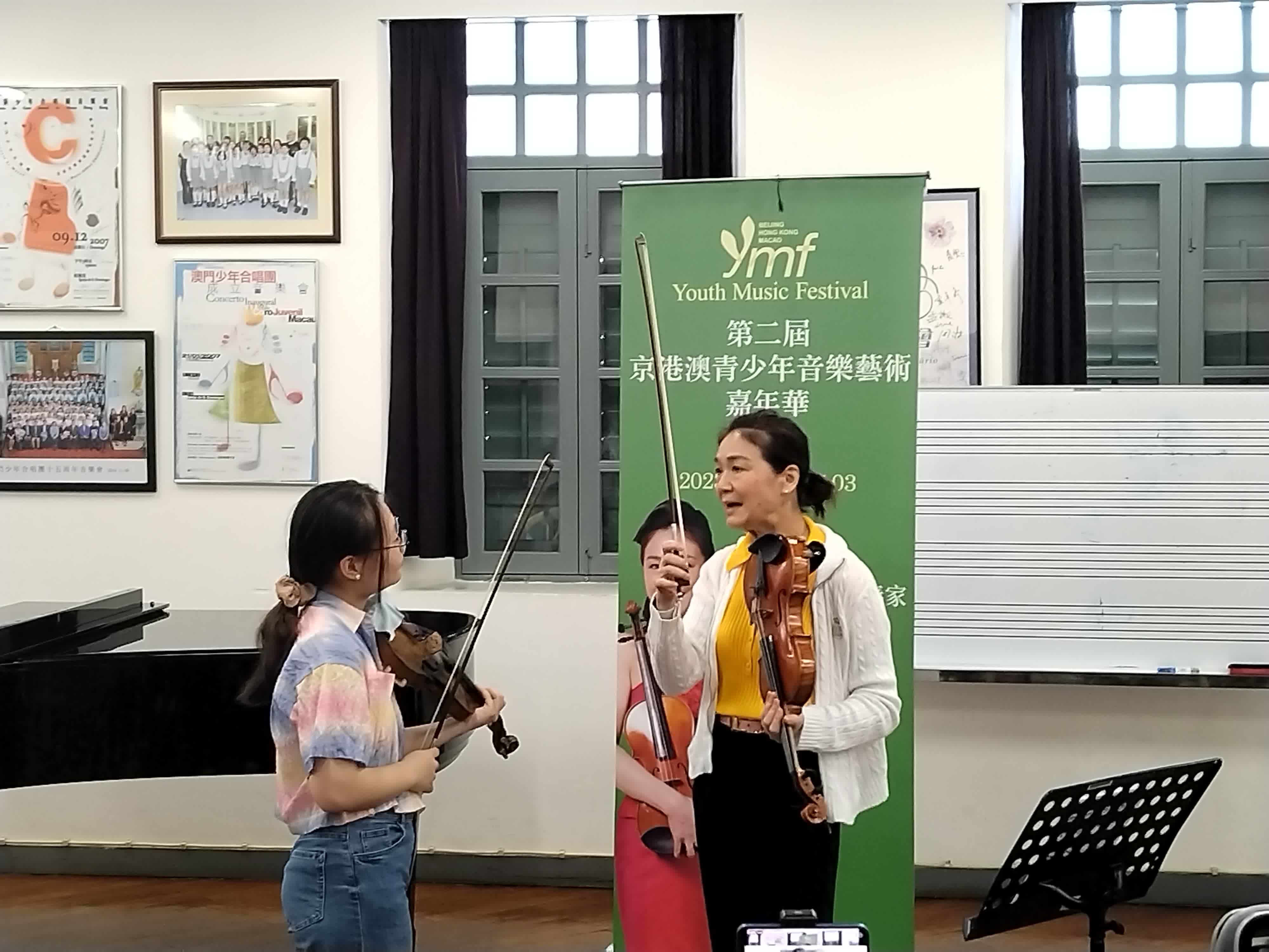 在澳門期間,多位演奏家面向三地熱愛音樂的青少年開啟大師課。在香港小提琴演奏家姚珏的大師課上,來自內地和港澳的小琴手們在澳門演藝學院表演了多個世界名曲,姚珏認真傾聽完學生們的演奏後一對一進行指正。「你很好,真的很棒,技術和音樂都很棒,你拉琴過程中有什麼問題?」在聽完來自中央音樂學院附中學生小提琴演奏後,姚珏一邊誇獎學生弓速快慢和諧,一邊親手指導學生的手法和力度。