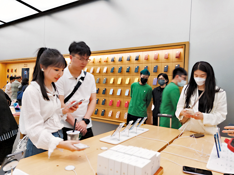 香港文匯報訊(記者 毛麗娟)除了到香港享受醫美服務、購買奢侈品,內地客也偏愛香港鬧市區蘋果專賣店的最新電子產品。儘管同一產品的標價數字一樣,但一個是人民幣價格、一個是港幣價格,由於匯率差,香港較內地價打八九折,還是有性價比,因而吸引不少內地客前來消費或是幫家人、朋友代購。