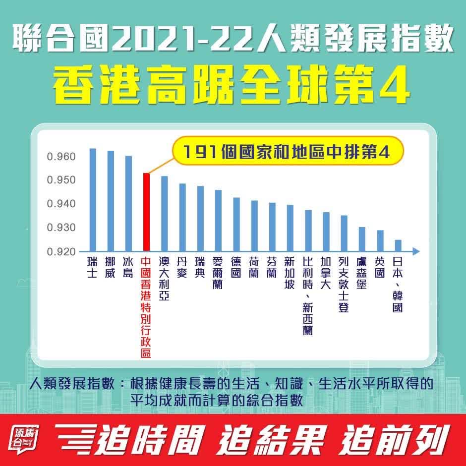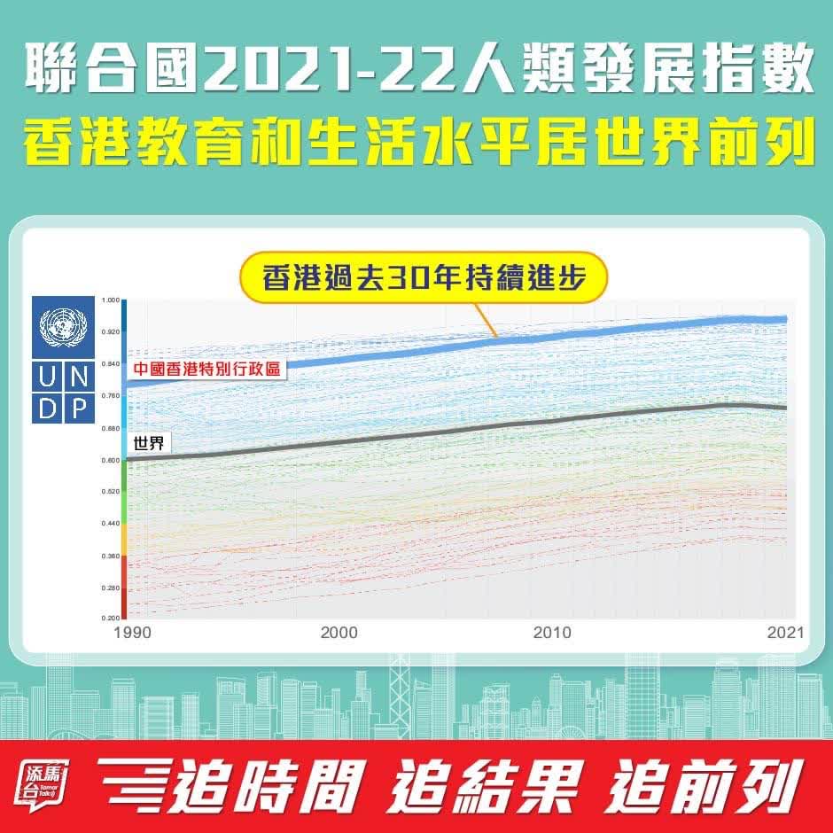 特區政府今日(5日)表示,香港作為國際大都會,很多範疇的表現都令人非常鼓舞。聯合國開發計劃署公布的《人類發展指數》調查報告顯示,2021年至22年香港在191個國家和地區中排名第4,意味着香港的教育和生活水平均位居世界前列。數據顯示,香港在過去30年間持續進步。