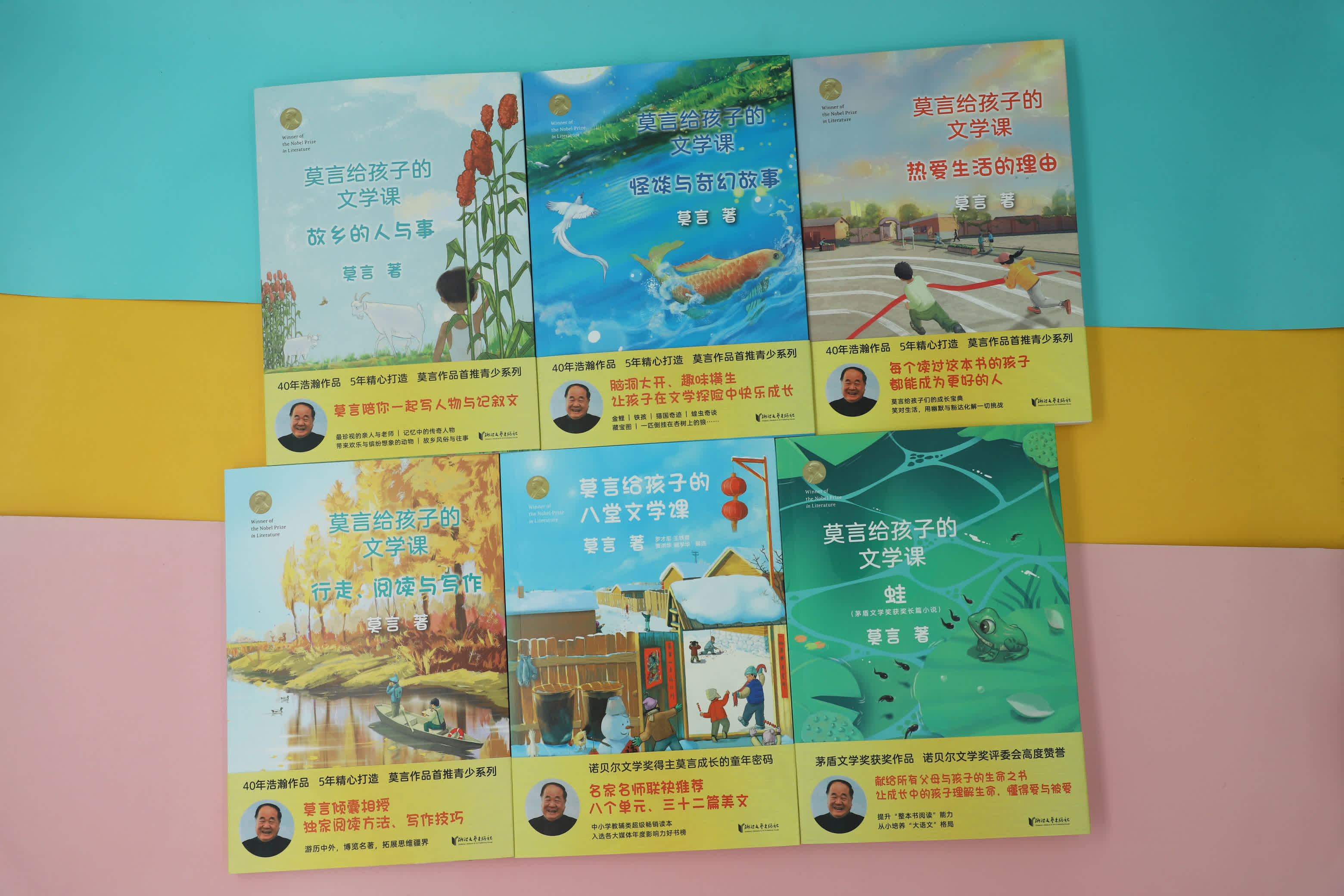 「莫言給孩子的文學課」系列共分為六冊,分別為《故鄉的人與事》《怪談與奇幻故事》《熱愛生活的理由》《行走、閱讀與寫作》《蛙》《莫言給孩子的八堂文學課》,作者莫言親自參與編選。其中,前四本分別圍繞人物、奇談、生活、閱讀寫作等四大主題展開,幫助孩子開拓想像力、培養積極向上的人生觀,提高閱讀和寫作能力;《蛙》是對莫言長篇小說代表作的完整選編,幫助孩子提高「整本書」閱讀能力;《莫言給孩子的八堂文學課》是由一線語文名師聯袂編選的、手把手教孩子閱讀諾獎作家作品和學習寫作的範本。這六部作品由淺入深、循序漸進,不僅可以使孩子一窺莫言如何成長為諾獎作家歷程,跟着莫言拓展想像力、學寫作、讀名著,提高閱讀和寫作能力,也可以幫助孩子開闊人生視野,學習莫言幽默風趣的人生態度,養成樂觀堅韌的美好品格。