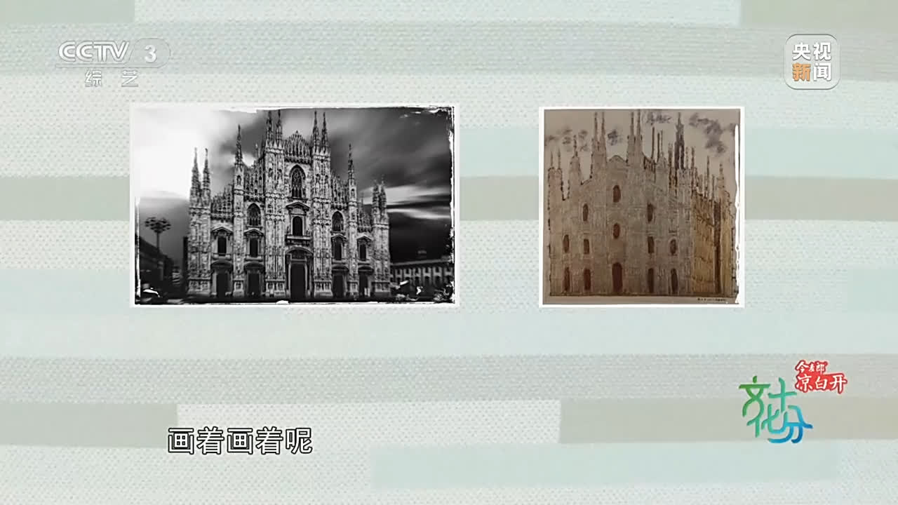 黃永玉的兒子 黃黑蠻:他當時就是經常在街上去寫生,有時候我們就跟着他。有一次在米蘭大教堂,這裏也有那幅畫,他也在那畫畫,畫着畫着呢,遠處走來一個瘋子,一路走,一路指手畫腳,很危險。我說壞了,他要走過來一下把畫架踢翻了怎麼辦,然後我就準備在那兒擋着,結果那瘋子走近以後,看着畫畫很靜,就仔細地看畫畫,也不瘋了,眼神就很純凈地看,看了差不多10分鐘,慢慢就離開了,完全沒有那瘋勁,然後走出10米遠又是手舞足蹈,所以很好玩這些。