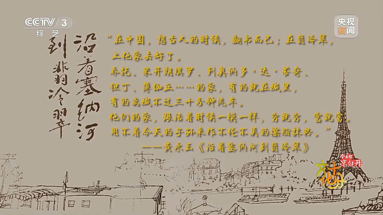 1925年,徐志摩寫了一首詩,名字叫做《翡冷翠的一夜》,將意大利的城市佛羅倫薩命名為翡冷翠。就在這首詩問世的前一年,黃永玉在湘西出生了,這個土家族的孩子在近一個世紀的風雲變幻中始終保持着孩童的好奇,用雙腳丈量世界,一路從湘西走到了歐洲,從塞納河走到了翡冷翠,並寫下了散文集《沿着塞納河到翡冷翠》,不久前,這本書新版發行,這位99歲的世紀老人站在百歲邊緣回首往事時,又有着怎樣的人生感悟?今天的節目,請大家跟我一道,前往黃老先生的家中做客。