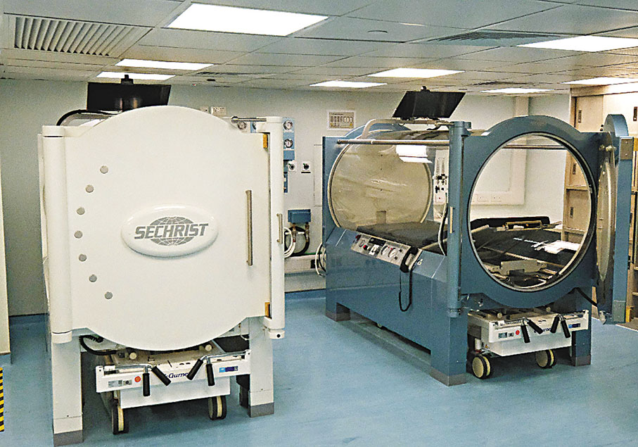 高壓氧治療中心顧問醫生殷榮華介紹,高壓氧治療一般適用於一氧化碳中毒、中心視網膜動脈阻塞、壞死性軟組織感染等緊急病症,亦可用於放射性治療後發創傷、嚴重及複雜傷口等慢性病症,「現在的多人治療艙多為緊急病患者服務,而增設單人治療艙之後,穩定的慢性病患者就可以在那裏接受高壓氧治療,這樣治療不同類型病人的靈活性就可增加。」