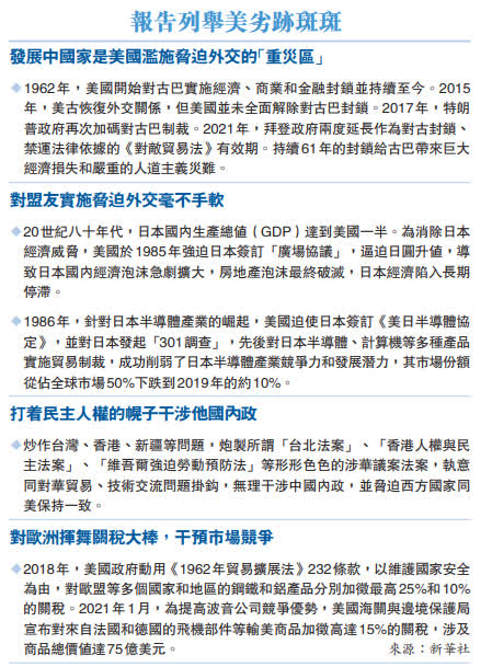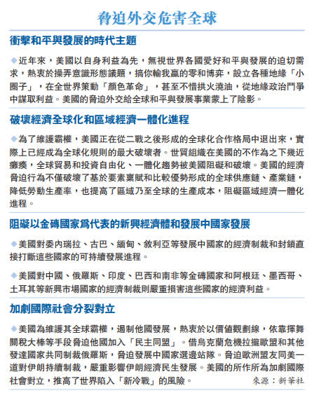 新華社18日發表題為《美國的脅迫外交及其危害》的報告,指長期以來,美國脅迫他國無所不用其極,在脅迫外交上有極不光彩的「黑歷史」。時至今日,脅迫外交更是美國外交政策工具箱中的標配,為實現一己私利,政治、經濟、軍事、文化等各領域的遏制打壓都被用來在全球搞脅迫外交,世界各國深受其害,發展中國家首當其衝,連其盟友夥伴也難幸免。報告基於大量事實和數據,旨在揭露美國在全球推行脅迫外交的惡行劣跡,讓國際社會進一步看清美國外交的霸權霸道霸凌本質,以及美方行徑對各國發展、地區穩定、世界和平造成的嚴重損害。