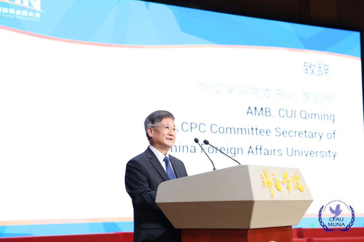 外交學院黨委書記崔啟明大使、外交部國際司蔣端公使、中國聯合國協會前副會長兼總幹事龐森大使等出席了大會開幕式。崔啟明大使在致辭中表示,當今世界百年未有之大變局加速演進,聯合國作為多邊主義的核心,是完善全球治理、維護國際公平正義的主要平台。中國一直以來積極維護多邊主義,致力於推動構建人類命運共同體。面對這一願景,當代青年正是生逢其時的「生力軍」,而模擬聯合國大會則是助力青年參與全球治理的「練兵場」。新時代中國青年應厚植家國情懷、拓寬全球視野、貢獻青年智慧,以擔當意識、創新精神描繪全球治理的發展藍圖,探索熱點問題的解決之道。蔣端公使也在致辭中講到,希望在本次大會來自不同國家的青年能互學互建、增進友誼、攜手前進,成為維護和推動多邊主義的新生力量,為世界和平與發展作出貢獻。開幕式後,龐森大使為與會代表作《中國與聯合國》專題報告,對我國外交外事工作和全球治理工作發表了深刻的分析和獨到的見解。