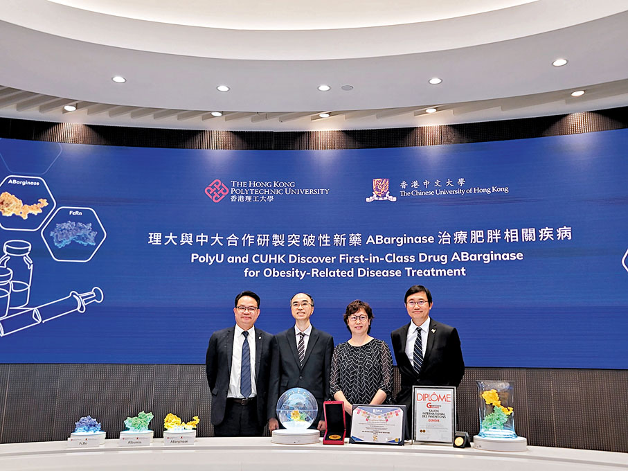 肥胖不僅影響體形,更有機會牽涉許多如糖尿病、非酒精性脂肪肝、癌症等慢性疾病,是全球最為普遍的健康問題之一。不過,現時患者往往需要服用不同藥物去治療各種互相關連的疾病,導致副作用風險增加。由香港理工大學與香港中文大學合作研發的新藥ABarginase,是全球首創一種可治療多種與肥胖症和胰島素抵抗相關的代謝性疾病,其利用嶄新的「消耗精氨酸」藥理機制,抑制脂肪合成和增強對胰島素的敏感度,為患者提供安全和藥力持久的療效,且製藥成本低而高效,讓更多患者可負擔和受惠。◆香港文匯報記者 鍾健文