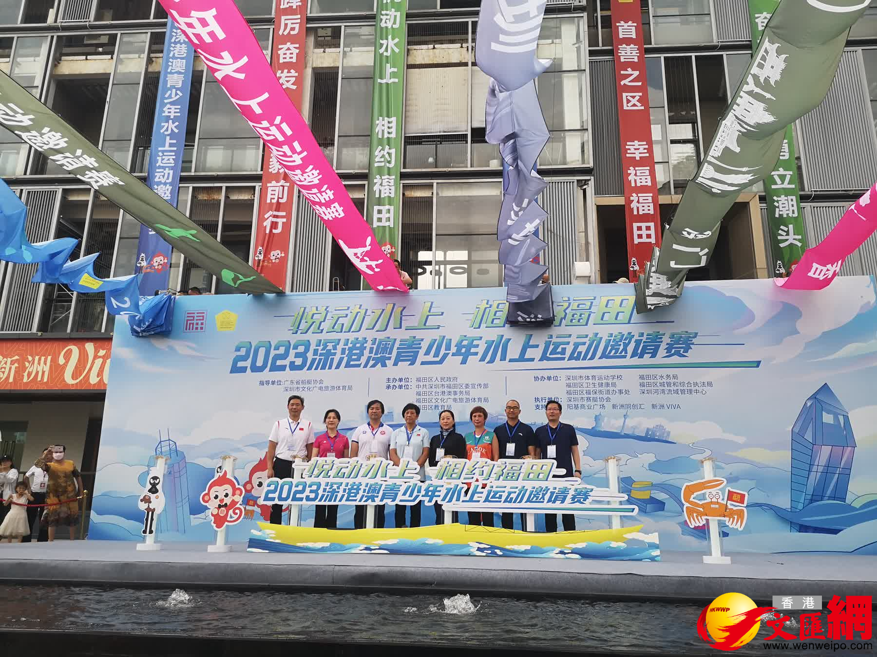 啟動儀式上,在場嘉賓一同按下啟動裝置,六條代表深圳、香港、澳門和賽事主題的飛布瞬間從主舞台上方飛嘯而過,連接新洲河兩岸。「一衣帶水、親如一家」,彩色飛布的精彩飛躍和美好蘊意將開幕式活動推向高潮。