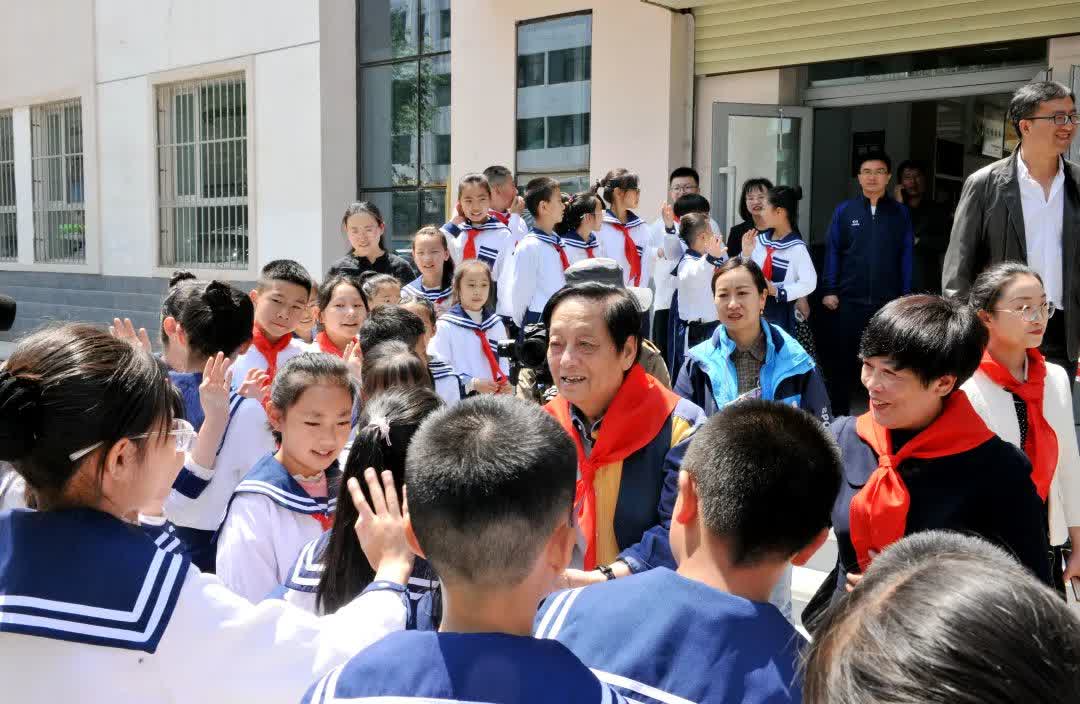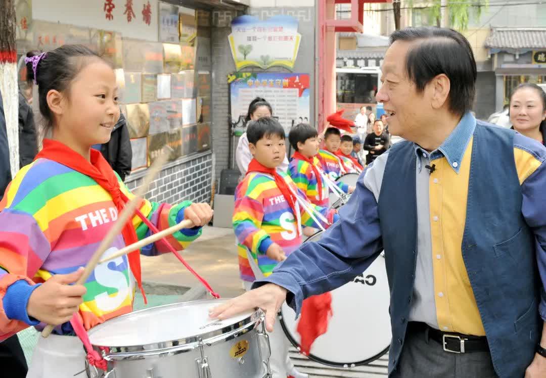 上午十點,在響亮的鼓號聲中,韓美林一行來到了西寧市西關街小學。剛到學校門口,韓美林就被孩子們熱鬧的軍鼓聲震撼。一千多名朝氣蓬勃的小學生們隔着老遠就大聲呼喚「韓爺爺好!」「歡迎韓爺爺!」這熱情洋溢的童音呼喚,讓原本有些高原反應的韓美林煥發了精神。他忍不住去抱抱孩子,不停地和孩子們揮手致意,回應着「謝謝你們!」