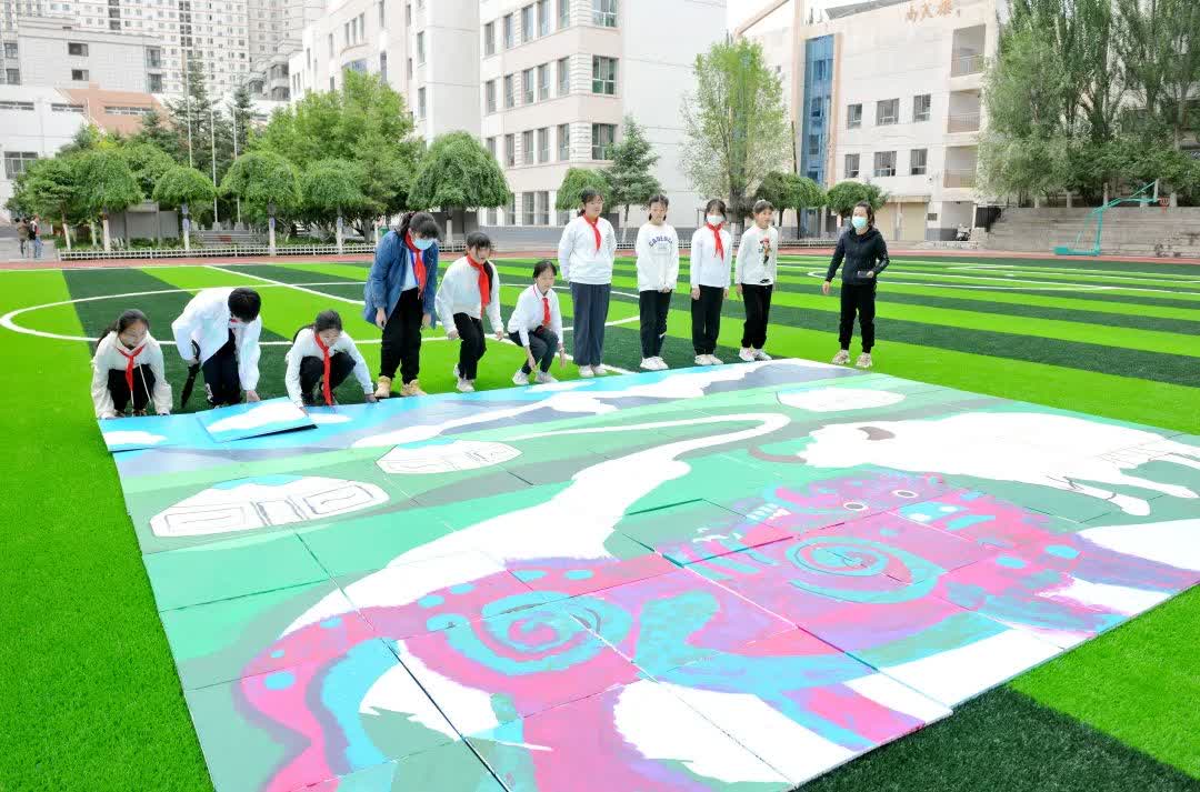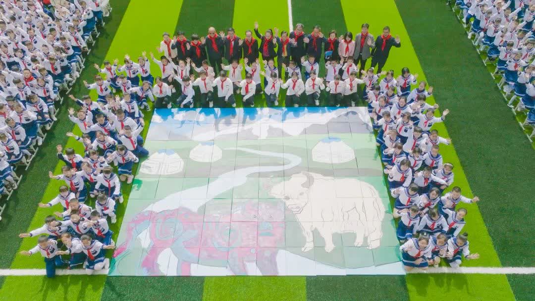 西關街小學的80位學生,也為他們心心念念的韓美林爺爺準備了一份「大禮」——一幅由80塊畫板組成的、繪製着韓美林「孺子牛」與青海「三江源」白氂牛的藝術大畫。小小的畫板裏是大大的藝術理想,要像韓爺爺一樣,在藝術的探索之路上「俯首甘為孺子牛」。