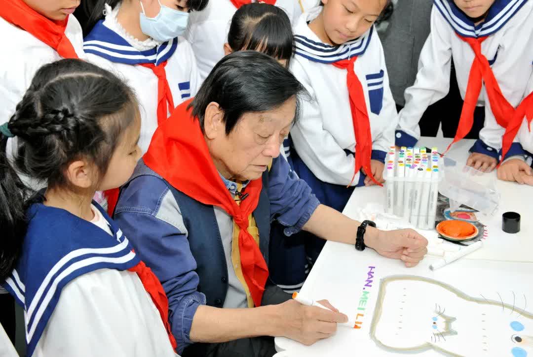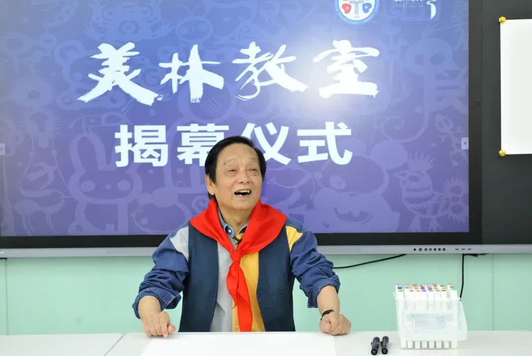 在新落成的「美林教室」裏,韓美林化身小學老師,為孩子們答疑解惑。當孩子們問到毛絨絨的小動物是怎麼畫出來時,韓美林暢快地將自己的「獨家秘訣」傾囊相授,毫無保留,聽得孩子們陣陣驚嘆。