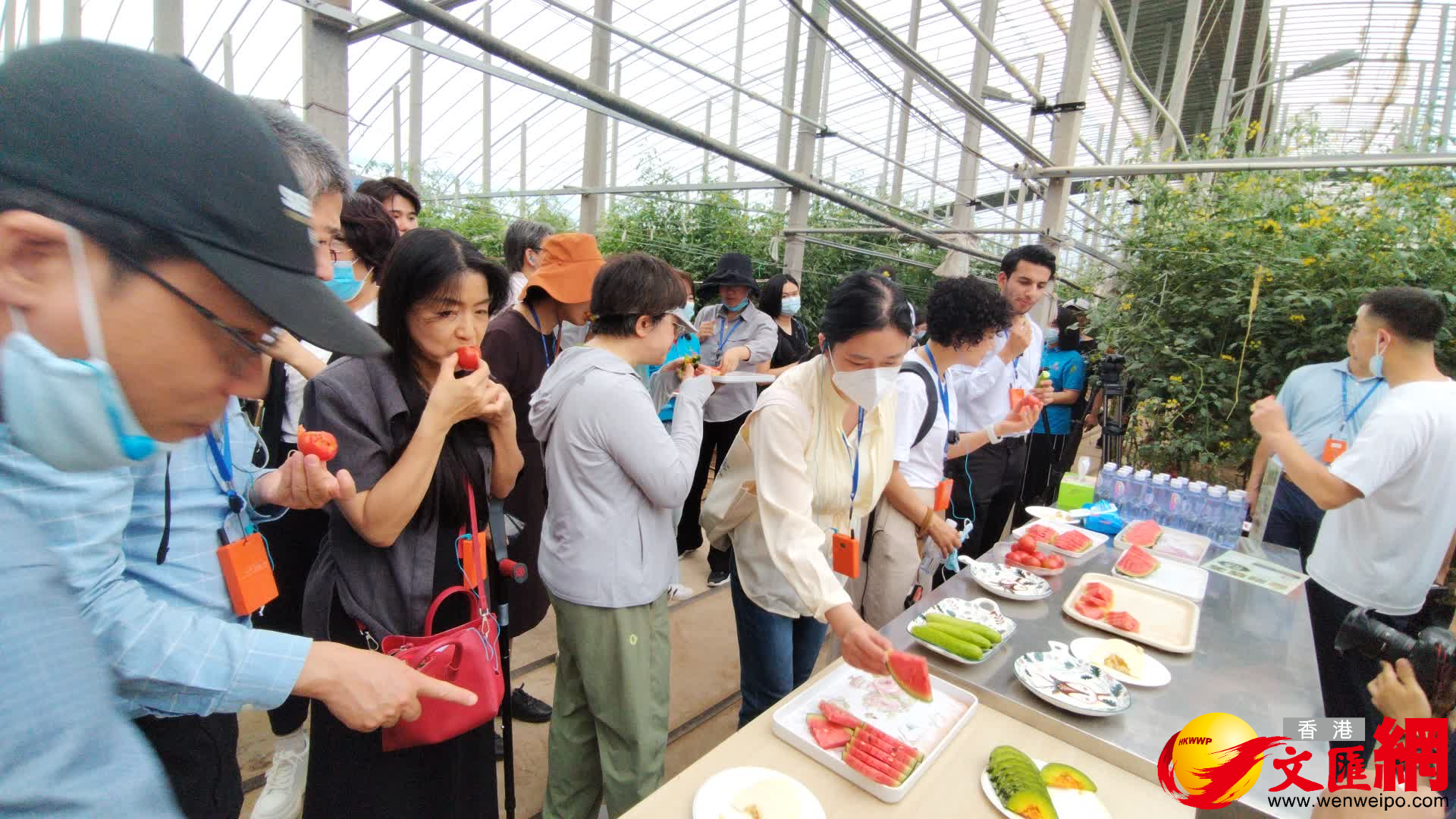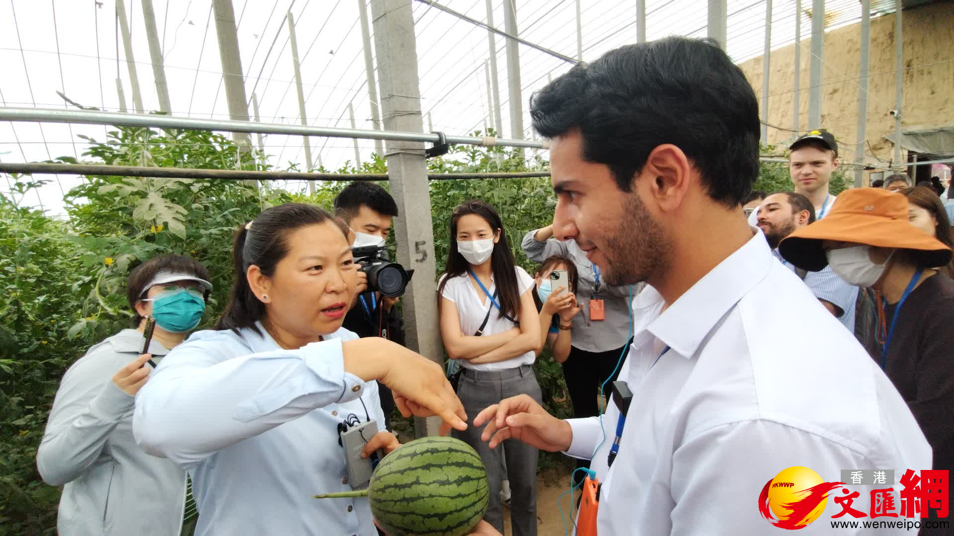 (香港文匯網記者 馬曉芳 北京報道)「北京高質量發展·走進大興——感受科技發展利用和新農村特色種植產業」主題境外媒體集體採訪活動5月31日下午舉行。美聯社、路透社、CNBC、NHK日本廣播協會、朝鮮日報、中阿衛視等16家境外媒體近40名記者前往北京大興國際氫能示範區、四季陽坤農業科技公司種植基地參觀,實地感受北京氫能應用的發展及新農村特色種植產業情況。在北京大興龐各莊四季陽坤蔬菜大棚,境外媒體人不僅近距離了解到昔日小麥玉米地如何蛻變成科技大棚,還親口品嘗甜美西瓜,中阿衛視駐京記者方浩明還現場學習如何挑西瓜,大讚:太甜了!