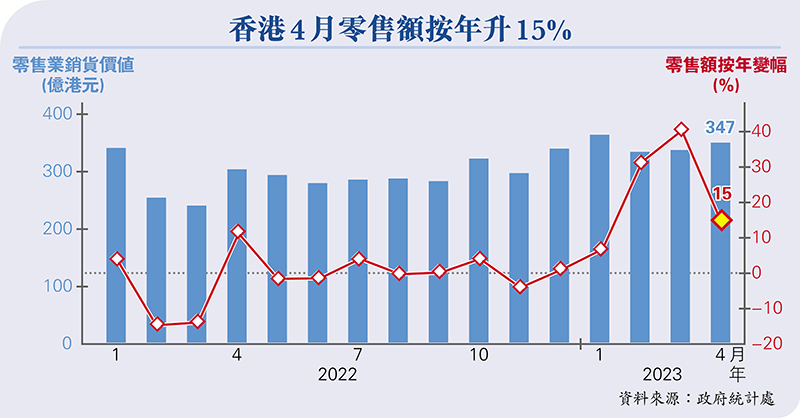 李婉茵續指,香港是一個比較特別的地方,無論去哪一個區都很方便,對比起其他國家,電子商務的需求不算很大。疫情改變了整體營商環境,零售商需要引進電子化服務開拓新客源,包括網店、網上直播,再配合實體店提供體驗及產品示範,兩者缺一不可。零售增長仍靠旅客撐起,今年4月零售額臨時估計為347億元,按年升15%,高於市場預期(見表),與旅遊消費相關的零售類別全面造好,當中珠寶首飾、鐘錶及名貴禮物零售額按年飆75.2%。