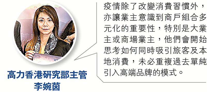 高力香港研究部主管李婉茵接受香港文匯報訪問時表示,疫情除了改變消費習慣外,亦讓業主意識到商戶組合多元化的重要性,特別是大業主或商場業主,他們會開始思考如何同時吸引旅客及本地消費,未必重複過去單純引入高端品牌的模式。這衍生出許多特色店舖,例如餐廳及小店,將商舖市場帶進多元化生態之中,以往單純由奢侈品牌組成的商戶組合未必會再出現。