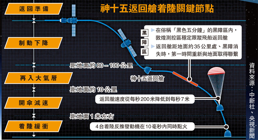 神十五乘組此次採用快速返回方案,「夜發朝至」。3日21時29分,神十五載人飛船與太空站組合體成功分離,繞地球飛行5圈後就開始返回地面。