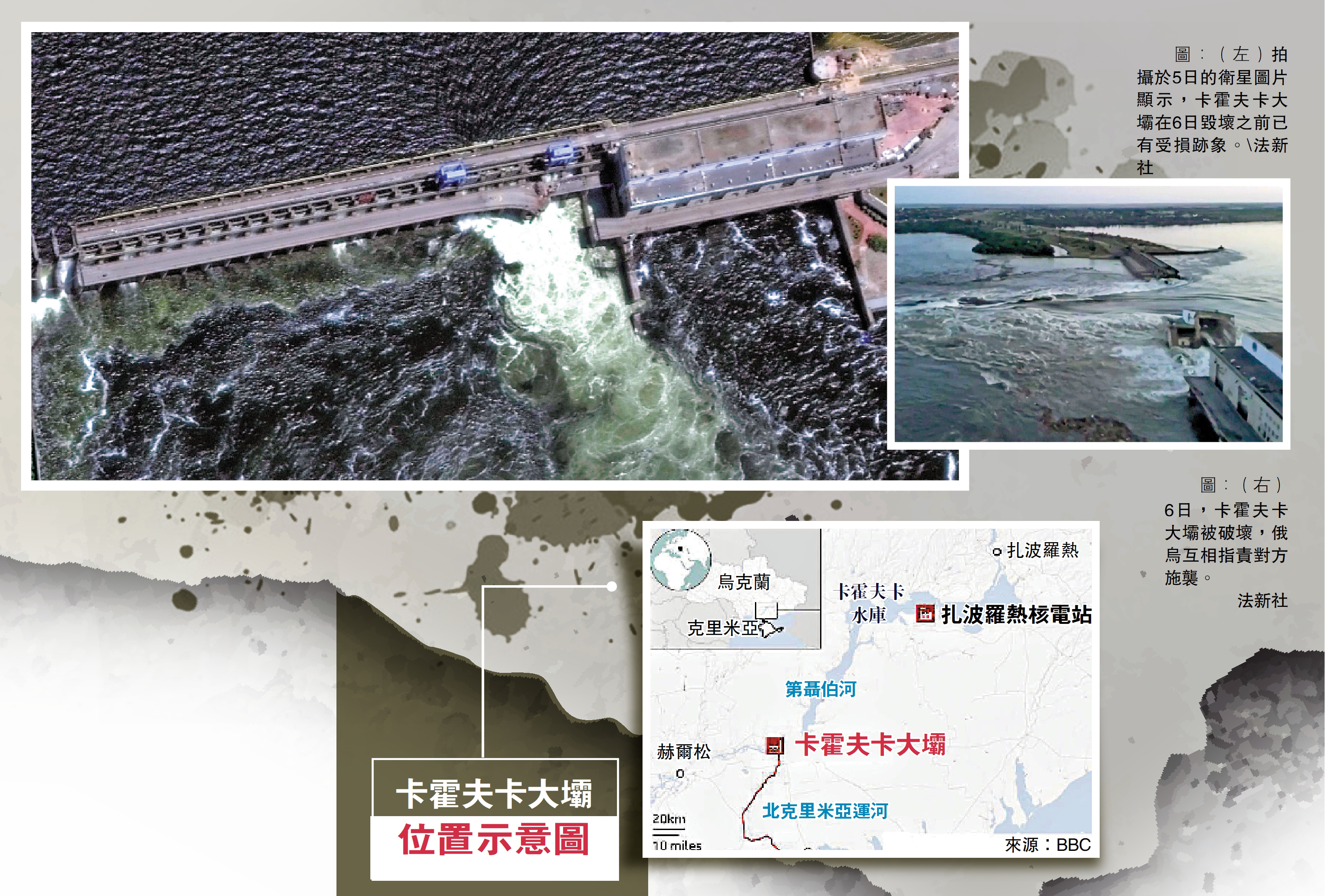 (大公報綜合CNN、塔斯社、美聯社報道)當地時間6日凌晨,烏克蘭南部赫爾松州俄軍控制地區的卡霍夫卡水電站大壩被炸毀,洪水奔流而下,威脅數萬平民。俄烏分別組織各自控制地區的居民撤離,並指控對方襲擊大壩。這座大壩位於第聶伯河上,位置十分關鍵,其水庫為扎波羅熱核電站和克里米亞地區供水。烏方稱,俄軍為了阻止烏軍跨河發動反攻而炸毀大壩。俄方則指責烏方試圖切斷克里米亞供水,並藉此事掩蓋其反攻失利的事實。