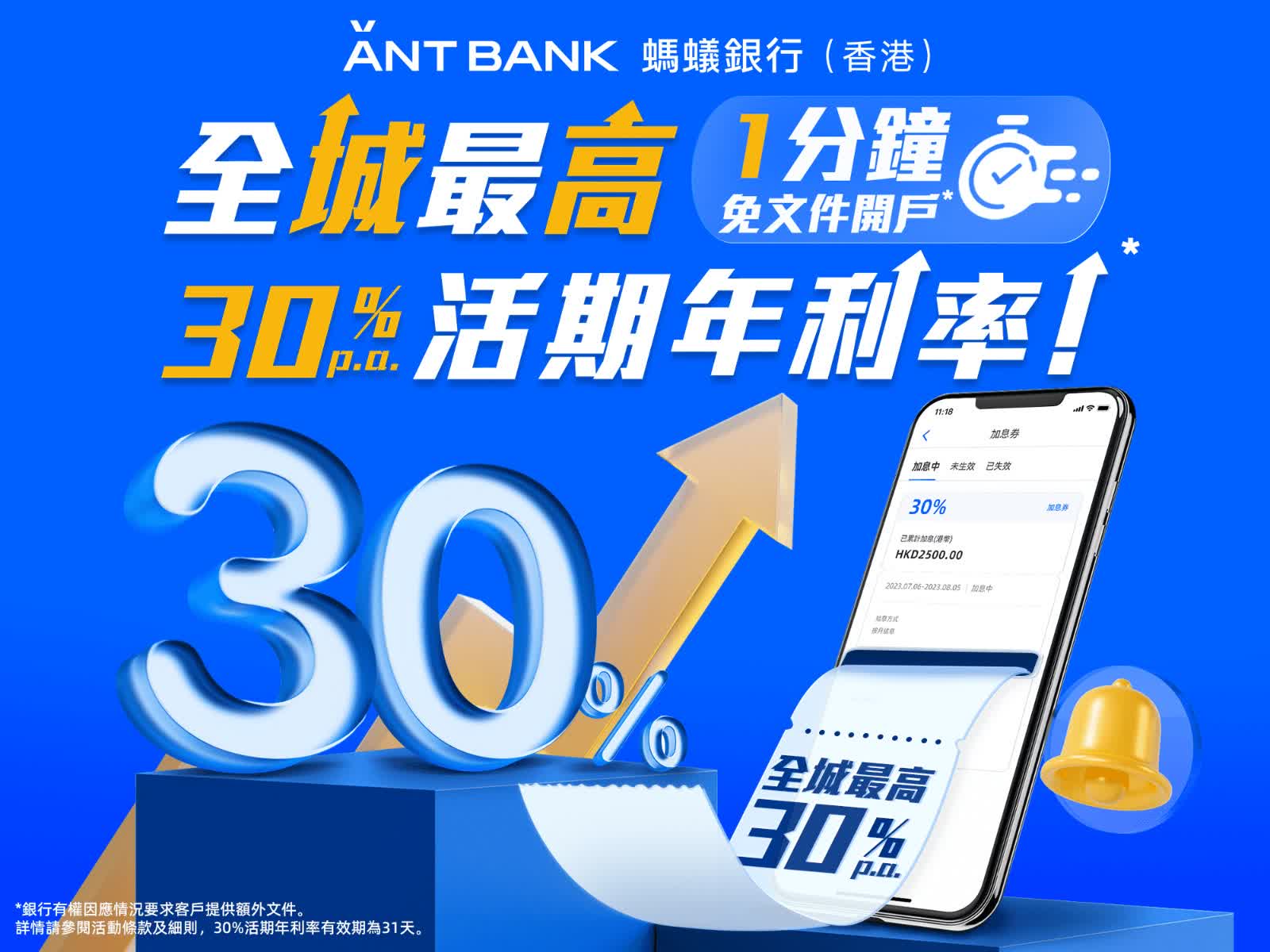 市民要開立傳統銀行或虛擬銀行戶口,均須遞交一系列證明文件完成開戶。螞蟻銀行(香港)今日(7日)宣布推出簡化開戶流程服務,最快1分鐘即可極速開戶,新用戶更可搶全城最高30%存款寶活期年利率。