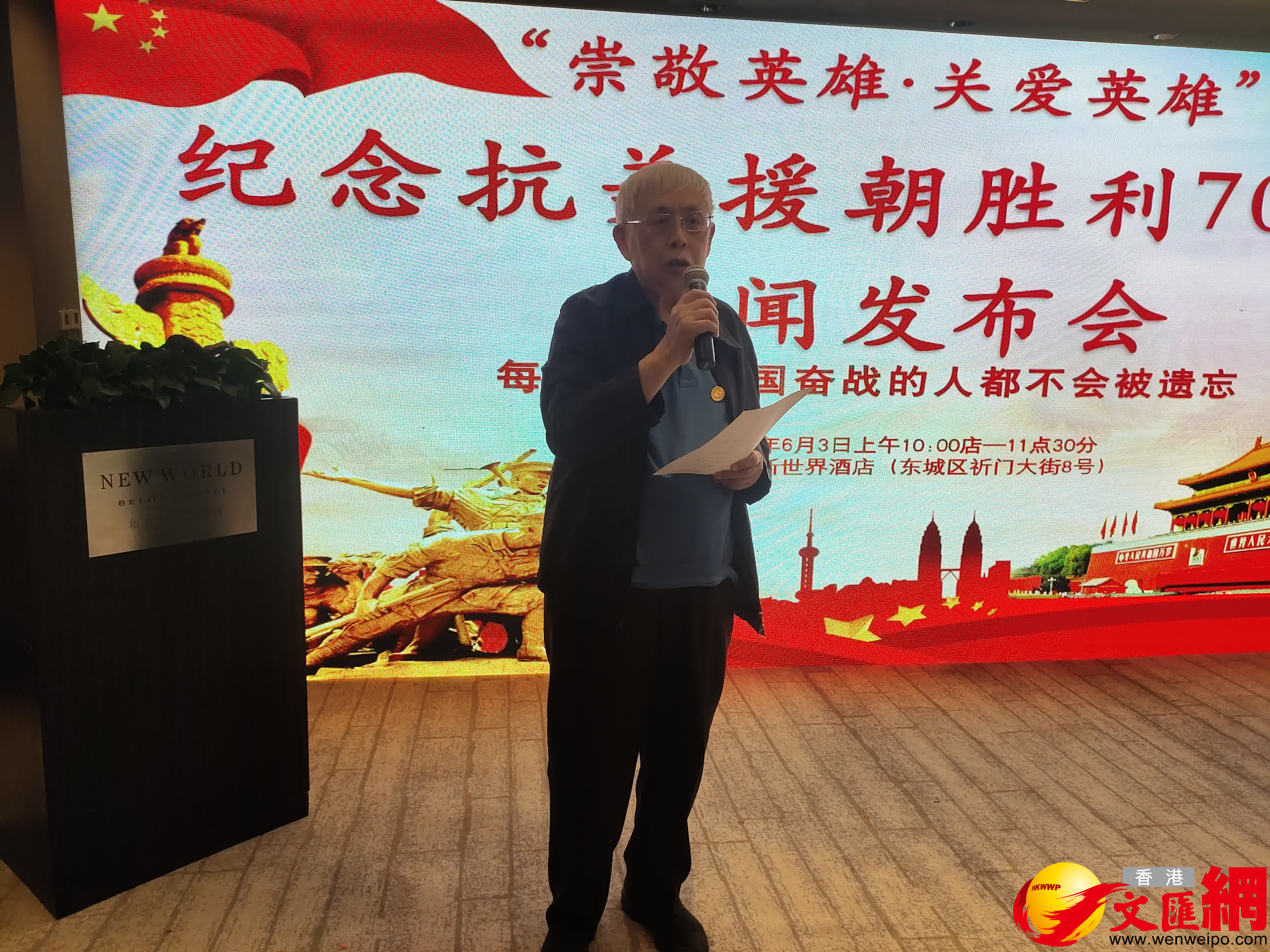 (香港文匯網記者 任芳頡 郭瀚林)近日,由中海洋(北京)文化藝術院獨家發起並主辦,志願軍研究會、中國國際文化促進會、中華英烈遺屬專項基金等部門聯合協辦的「紀念抗美援朝勝利70周年暨『崇敬英雄·關愛老兵』新聞發布會」在北京舉行。陳毅元帥之子陳昊蘇、彭德懷元帥侄孫彭宇、郭沫若先生女兒郭平英、作家魏巍女兒魏平,以及戴海山、王文義、呂良、于楓等耄耋之年的志願軍老戰士出席發布會。本次活動藉助抗美援朝勝利70周年之際,呼籲全國各地、社會各界,凝人心、聚合力,一同關愛老兵,致敬英雄。