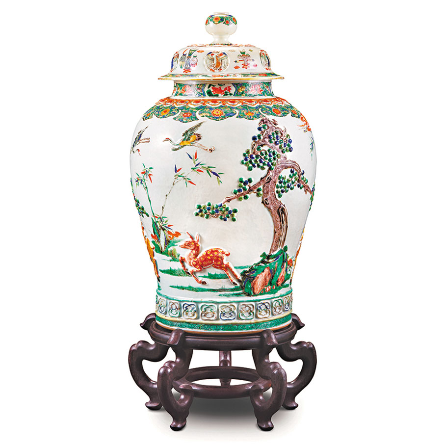 松竹梅紋樣在清代依然盛行,明代萬曆青花器將松柏與梅竹分區布局的方式,亦影響了清朝官窯的「三友圖」構圖,整體色彩更為豐富,畫風亦更為寫實。北京故宮博物院中的其中一件鎮院之寶,便是一支「清雍正琺琅彩松竹梅圖橄欖瓶」,彩料凝重、色澤亮麗。筆者所收藏的一尊「清康熙五彩刁瓷『松·竹·梅』大蓋罐」,更是採用了雕瓷的技法,突出了紋飾的立體感。◆作者:香港中華文化藝術推廣基金主席 李秀恒