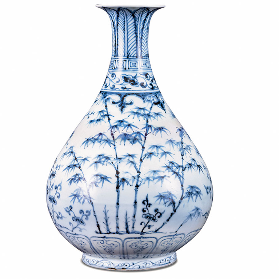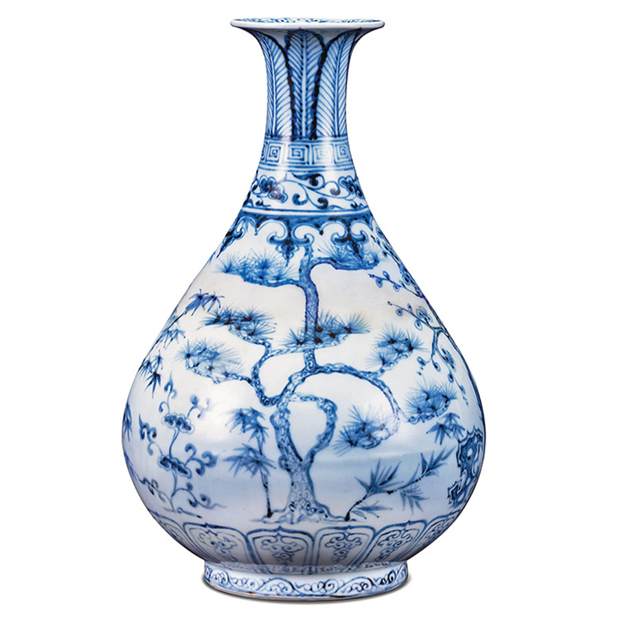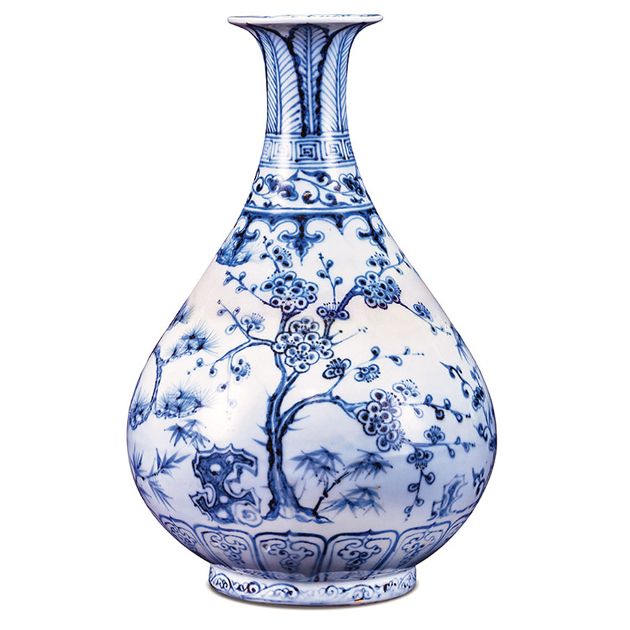 進入明代,以松竹梅紋入瓷畫的紋飾類別成為了常見的紋飾,寄託着古代文人對松竹梅高尚情操的嚮往與崇拜。明代瓷器上的「歲寒三友」,有別於元代各自單獨成樣的松竹梅,開始在構圖上相互交叉。筆者所收藏的一件「明洪武青花松竹梅玉壺春瓶」,由於為明早期出品,尚有前朝遺風。其後紋飾的發展更為豐富,部分增加了亭台樓閣、庭院山水等,更添文雅之氣。
