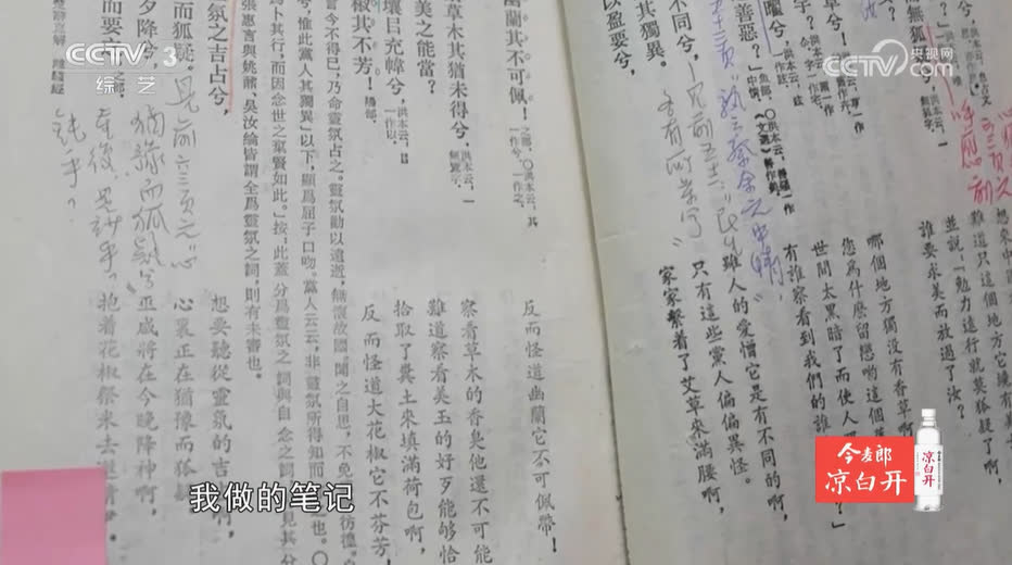 書畫家 范曾:我從7歲開始,我的父親就教我背它。當時我到了8歲的時候,可以全部滾瓜爛熟背。一直到今天,我不會忘掉裏邊一句的。因為過去的文人都把《楚辭》當作是必讀的一種書。床前要擺「史」「漢」「莊」「騷」——《史記》《漢書》《莊子》《楚辭》,騷就是楚辭代稱《離騷》。這裏有一本《楚辭》,1988年出版的,到現在三十多年了,書都看爛了。我有不同的時期、不同年月不同鋼筆我做的筆記。我把這個讀音、理解都寫在上面。