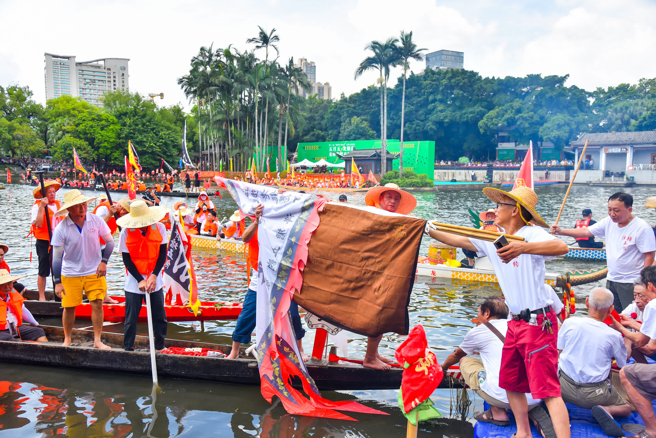鹽步老龍來到泮塘「探契仔」,泮塘「地主」仁威老龍也從荔枝灣出發迎客,還有來自茶滘、坑口、坦尾等兄弟村的龍船趁景而來,群龍巡遊聲勢浩大,鼓聲震天,旗幡飄揚飛馳而過,激起水面千層浪,也掀起了整個泮塘龍船景的高潮。泮塘仁威老龍還特意停靠在活動舞台邊,龍舟手們從船上抬下一筐筐端午手信送給現場的民眾,在荔灣湖邊觀看龍舟表演的民眾和遊客紛紛接過手信獲取好意頭。