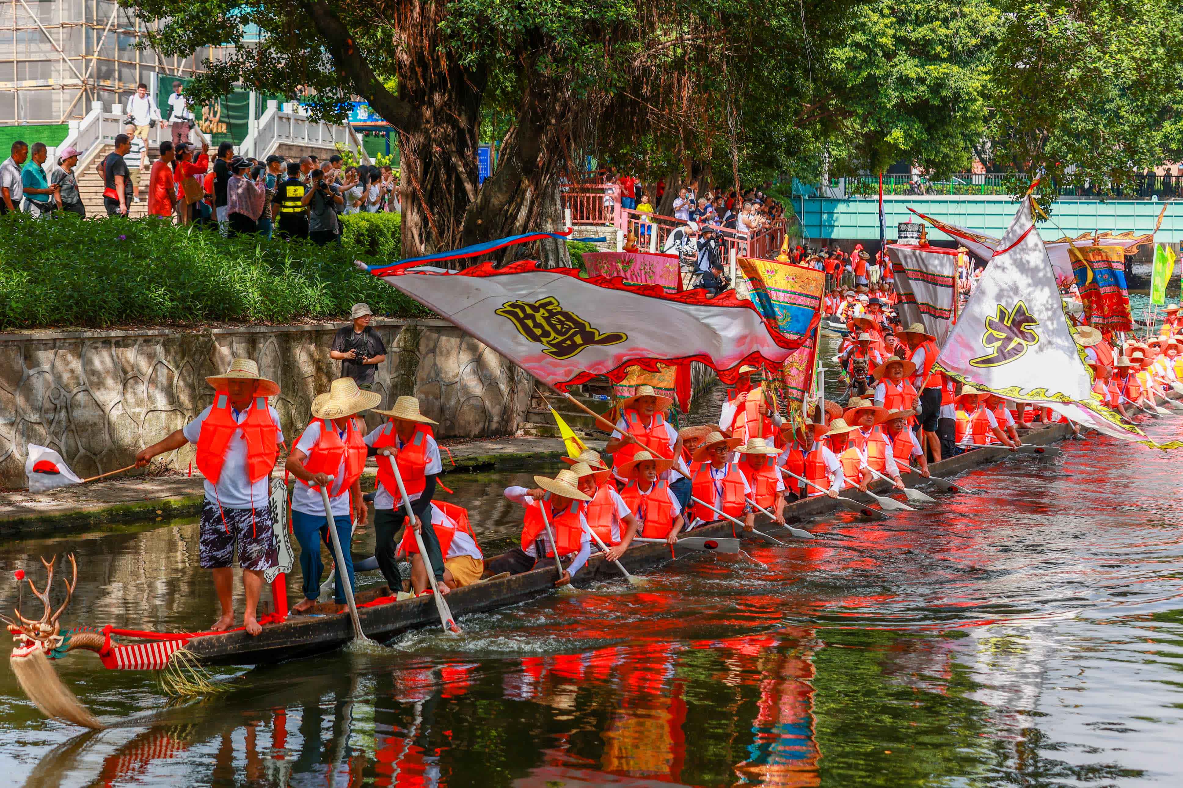 6月22日,第十三屆「荔枝灣·新西關」民俗文化活動「五月五·龍船鼓——龍騰荔灣啟新程」在廣州荔枝灣開幕,數十條龍舟匯聚荔枝灣涌一展風姿,秀龍、鬥龍、游龍……湖岸上遊客紛紛用手機和各種「長槍短炮」記錄,來自佛山鹽步和廣州泮塘的百年老龍舟遵循「龍舟探親」傳統,簪花掛紅互贈禮物。現場遊人不僅可以飽覽龍舟盛景,還可以零距離接觸百年老龍、體驗扒龍舟、合家歡樂遊園打卡、現場動手製作等,滿滿的沉浸式和參與感。