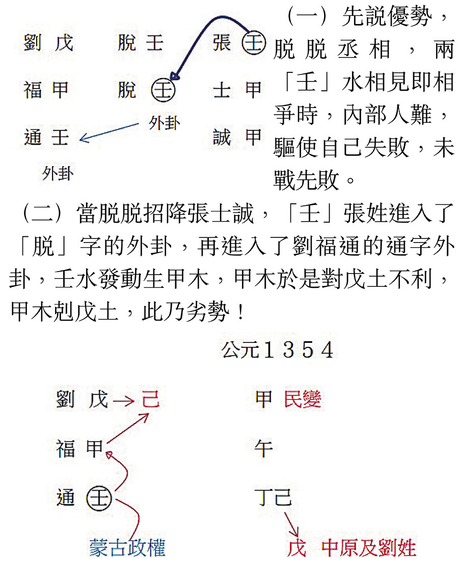 (二)當脫脫招降張士誠,「壬」張姓進入了「脫」字的外卦,再進入了劉福通的通字外卦,壬水發動生甲木,甲木於是對戊土不利,甲木剋戊土,此乃劣勢!