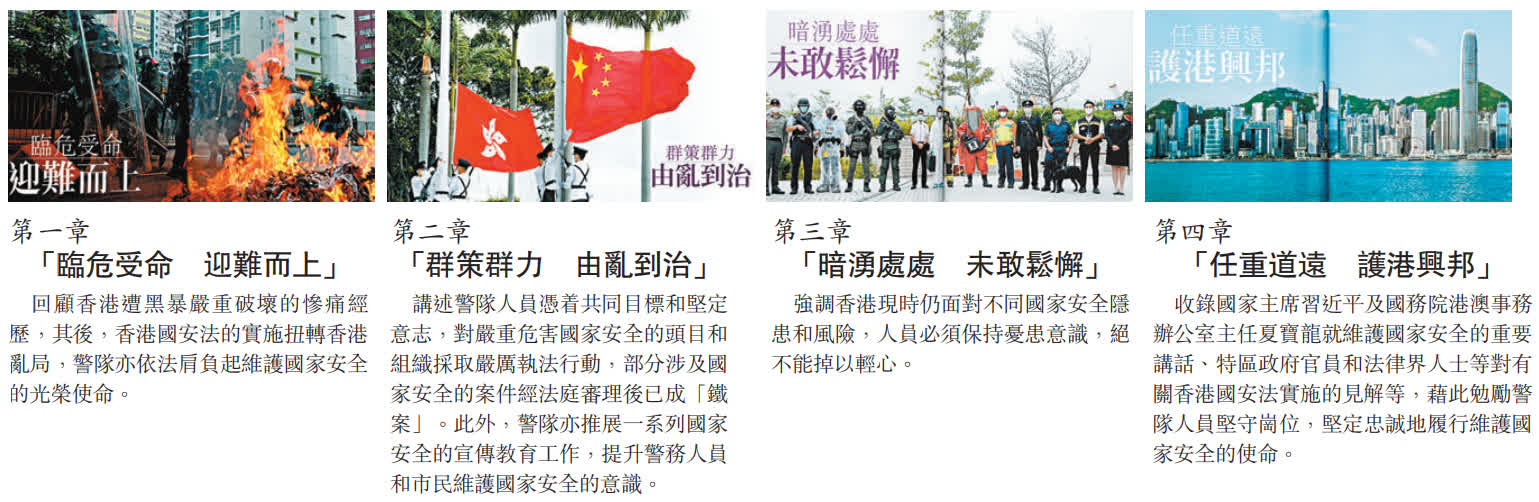 在香港國安法實施即將3周年之際,國安處推出紀念特刊《護港》,回顧依法維護國家安全的歷程和成果。警務處處長蕭澤頤為特刊作序,警務處副處長(國家安全)簡啟恩、國安處處長江學禮也接受了特刊訪問。