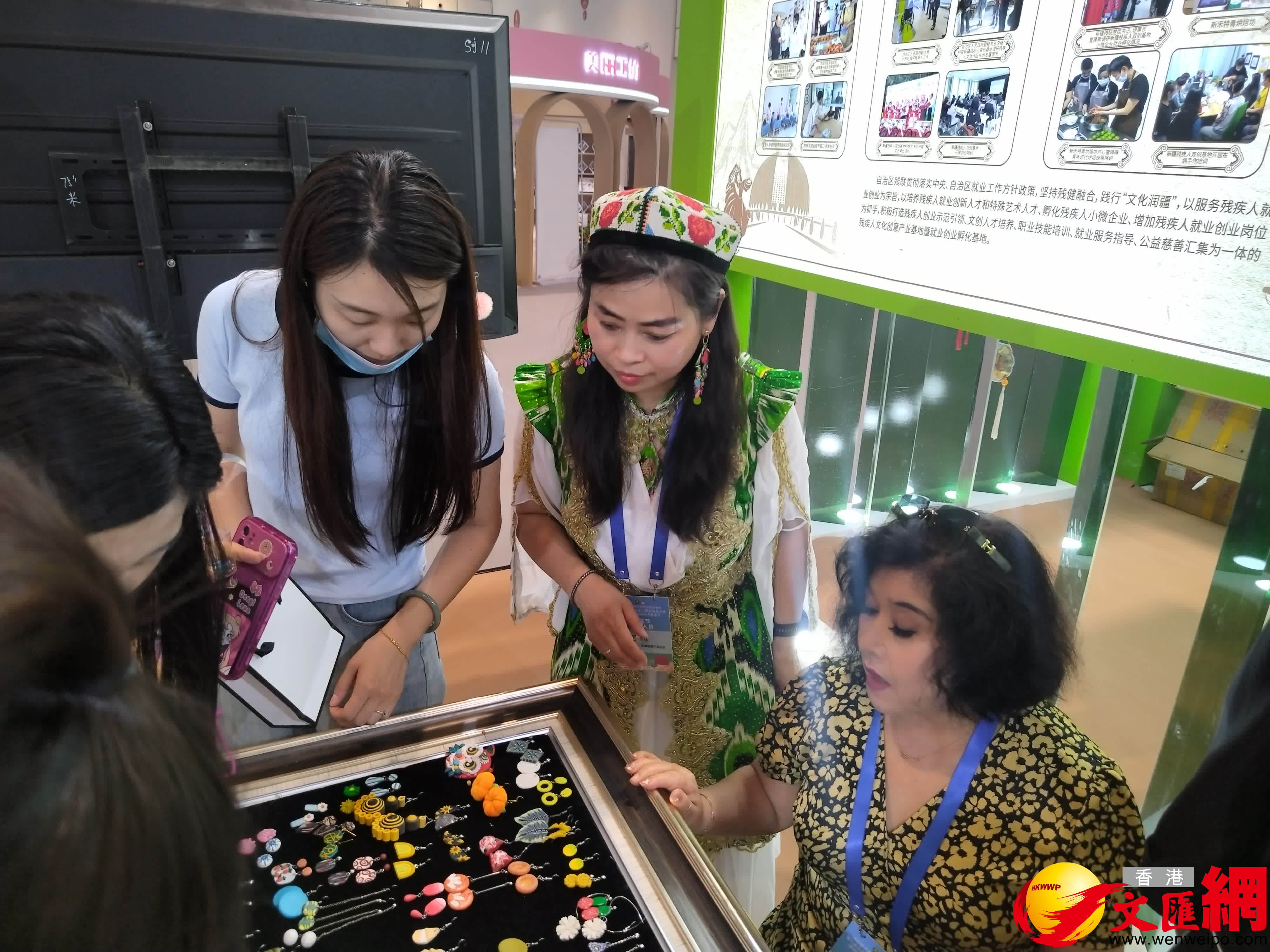 走進展區,就能看到羌綉、潮綉等「綉娘」們在認真展示高超刺繡技藝。來自貴州的侗族綉娘向記者介紹侗族刺繡,她創辦的刺繡坊已教授多位殘疾人學習刺繡,並幫她們售賣作品。在京津冀展區,掐絲琺琅、蘆葦畫等展台前都圍滿了參觀者,內蒙古展區悠揚的馬頭琴聲吸引不少人駐足,西藏展區展出的由殘疾人製作的唐卡做工精美,現場殘疾人製作的文創產品也備受青睞。會場中央來自宜生無憂的盲人按摩師現場服務,向與會者提供免費按摩體驗。在新疆展區,不僅有好吃的新疆特產,殘疾人製作的充滿異域風情的飾品讓不少「小姐姐」停下腳步。在文化助殘區,故宮文創現場展示了琉璃、官式古建築營造技藝(彩畫、鬥栱)以及景泰藍等文化藝術品,一名侏儒症患者正繪製景泰藍作品。