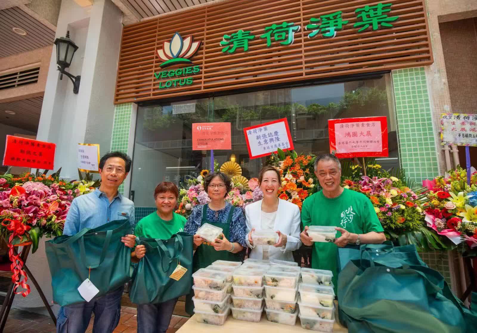 「清荷淨葉」新張期內,預計每月派發2000份素食飯盒予區內長者,信和集團總經理暨黄廷方慈善基金董事黄敏華女士,以及北河(明哥)慈善基金創辦人陳灼明先生(明哥)於新店開幕當天亦到場以表支持,业為受惠朋友送上營養餐盒及福袋。