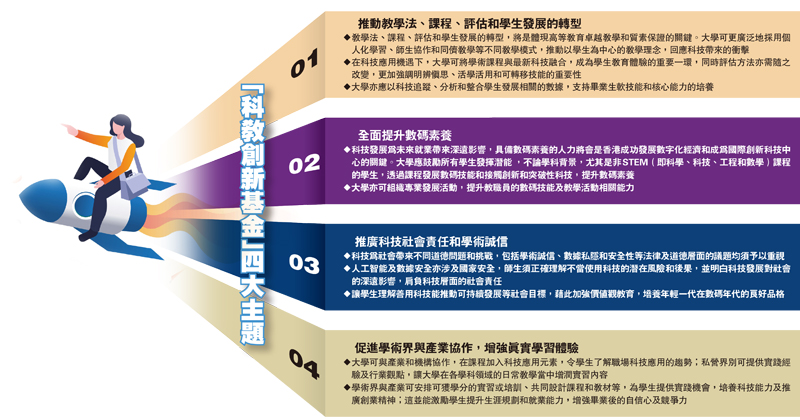 為應對這些方面的轉變,教資會在轄下質保局支持下設立一億元「科教創新基金」,鼓勵大學在教與學上積極探索及作出新嘗試。基金設四大主題,包括:一、推動教學法、課程、評估和學生發展的轉型;二、全面提升數碼素養;三、推廣科技社會責任和學術誠信;四、促進學術界與產業協作,增強真實學習體驗。