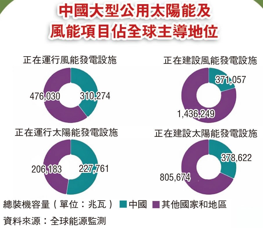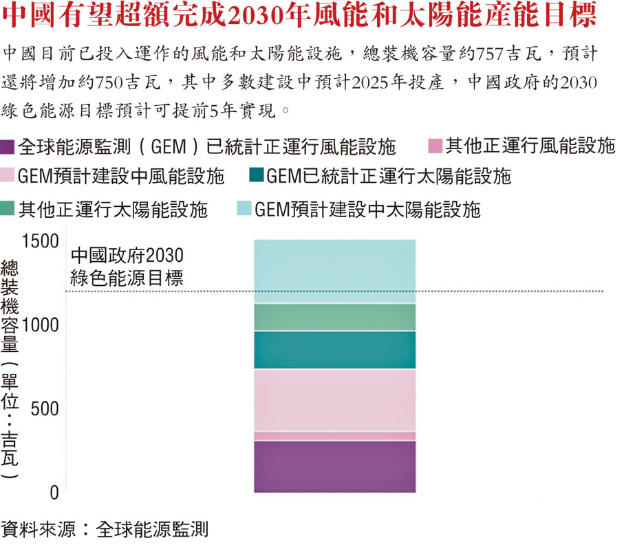 報告還提到,中國正在興建的風能設備,累計裝機容量預計將達371吉瓦,若中國現時興建的清潔能源項目能在2025年如期完工投入使用,全球的風力渦輪機數量足以增加近一半,大型公共事業用途的太陽能裝置數量更可以增加85%。