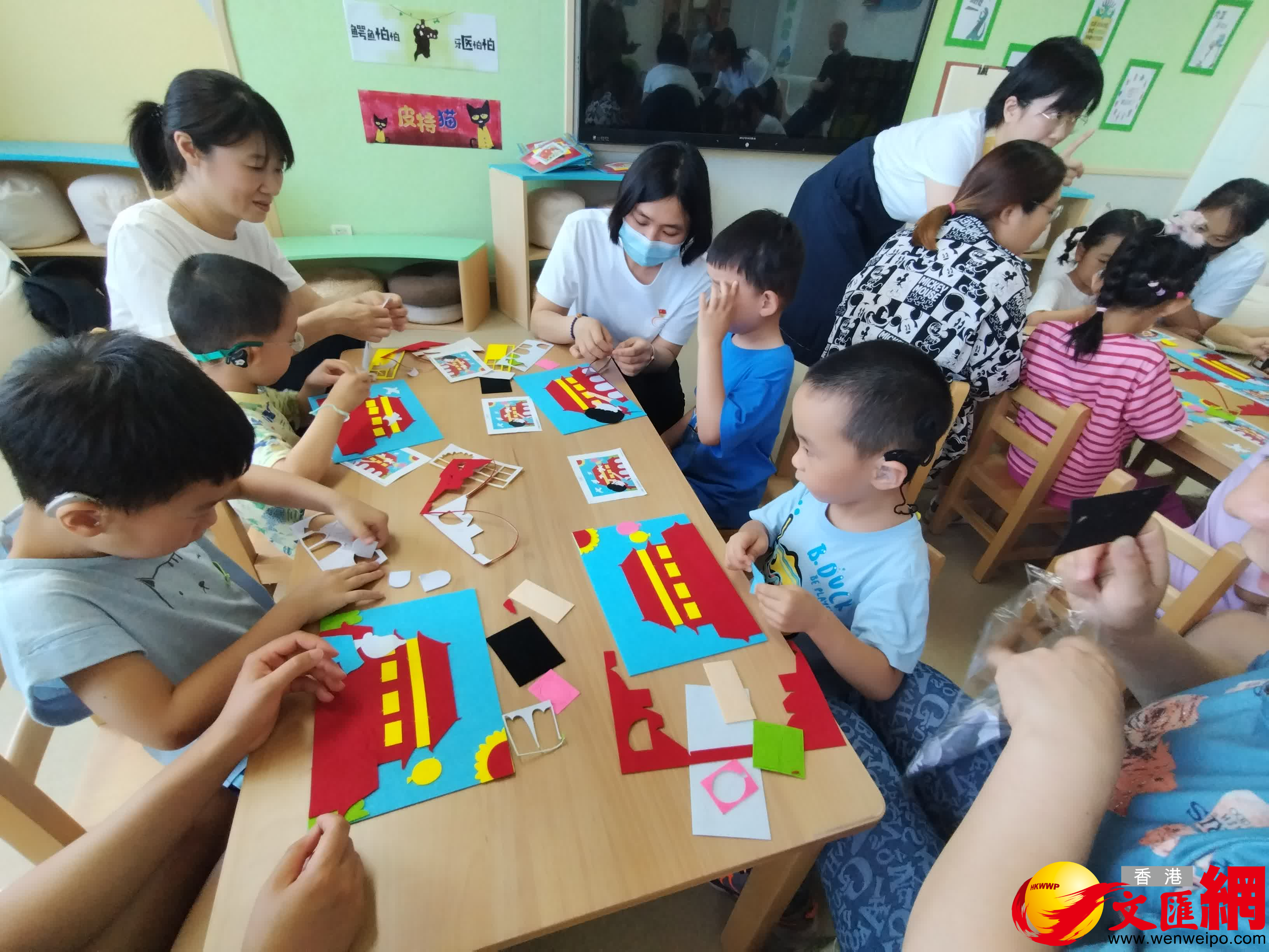 活動現場,老師、家長與孩子、嘉賓一起閱讀經典繪本,以建黨日為主題製作美工作品。佩戴助聽設備的小朋友們在老師和家長的幫助下,完成一幅幅色彩明艷、新穎別緻的手工作品,小朋友們的純真笑聲也給現場帶來很多歡樂。據介紹,國家館兒童繪本館由中國殘疾人福利基金會捐建,館內現配有國內外經典繪本和家庭教育、早期閱讀指導類圖書四千餘冊,適合2-8歲兒童閱讀,設有借閱服務台、綜合閱讀區、小劇場、親子共讀區和展示區等功能區域,除能提供在館閱讀和圖書借閱服務外,還能滿足讀書會、專家講座、創意美工、繪本劇表演等親子活動的使用需求。