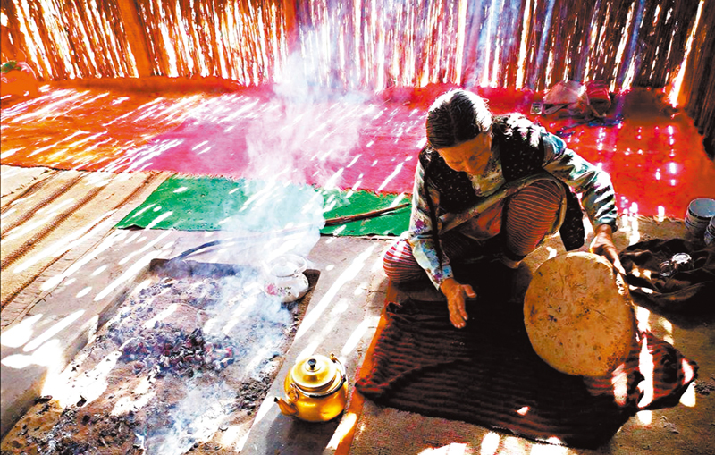 這裏的村民世代棲居在克里雅河畔,這條河流發源於崑崙山主峰的北坡,自南向北流動,深入塔克拉瑪干沙漠腹地,最後消失在達里雅布依老村深處。通過2017年、2019年兩期搬遷,村民們如今大多生活在120公里外的達里雅布依新村。老村保留了大部分古村落的風貌,每戶門口都有一眼矮小的壓井,井水溫熱。屋內最吸引目光的是火塘,在台地中央挖一個方形的、略低於枱面的淺坑,在坑裏點燃胡楊、紅柳枝,就可以燒水、做庫麥其(當地民族特色美食)。煙火一起,無數大小光柱從房頂投射下來,是攝影人求之不得的天然「影棚」。