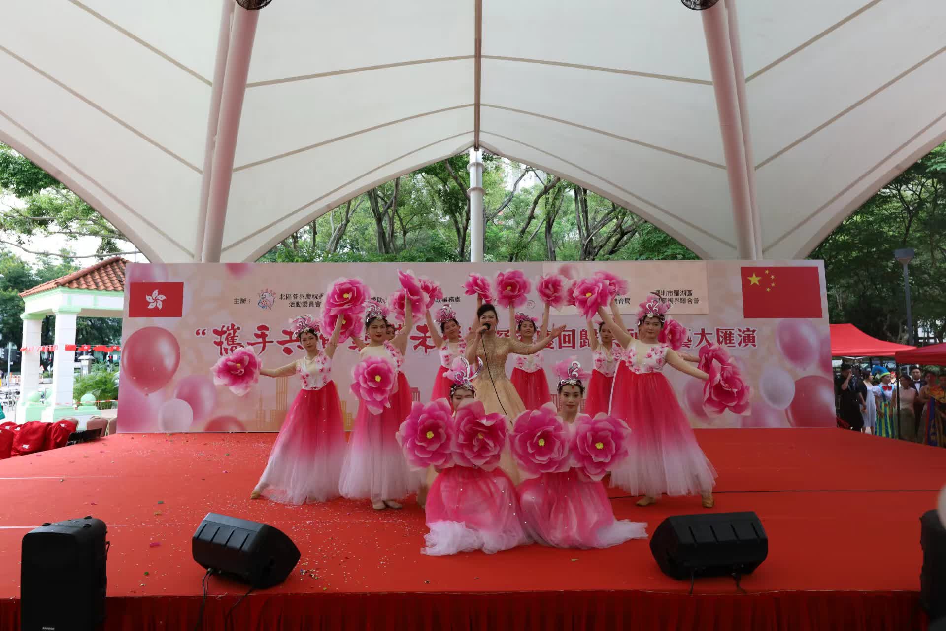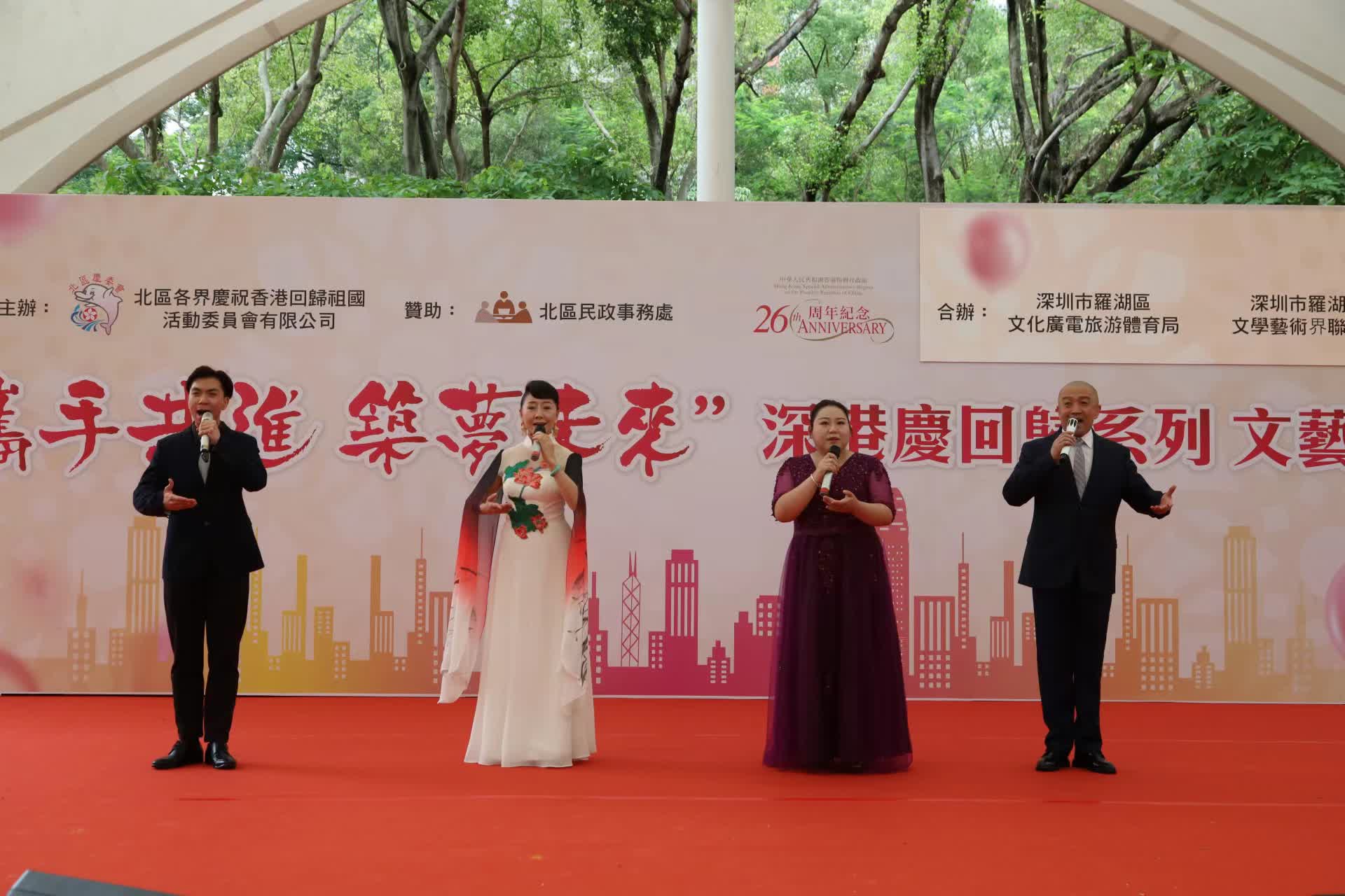 (香港文匯網記者 李望賢)為慶祝香港回歸,「攜手共進 築夢未來」深港慶祝香港回歸文藝大匯演7月1日下午在香港北區上水花園第一號公園舉行,香港中聯辦新界工作部、香港北區民政事務處、香港文聯以及羅湖區委宣傳部、羅湖區文化廣電旅遊體育局等領導嘉賓出席觀演。