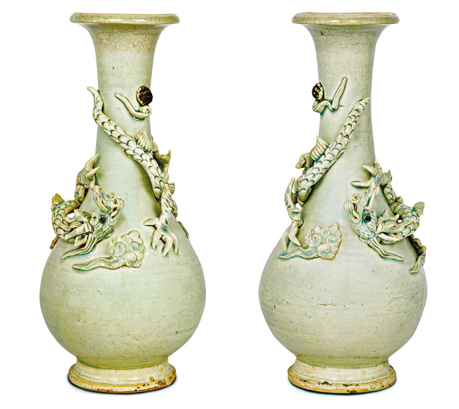 上述三種較早出現的技法,其實常常結合使用,後期更發展出了印花、貼花等工藝:印花是使用製作好的模子在瓷胎上印出特定的花紋,降低了手工要求,適合統一制式的批量生產;堆塑則是將模印好的泥塑粘貼在已成型的器物坯體表面,再入窯將二者黏連,極大地豐富了瓷器的外觀,如筆者收藏中的一對「宋影青蟠龍膽瓶」。◆作者:香港中華文化藝術推廣基金主席 李秀恒