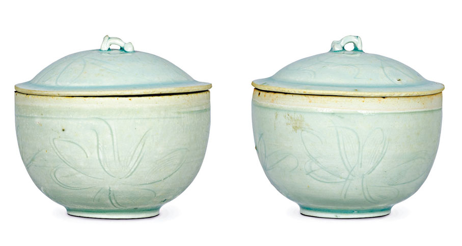 刻花在劃花工藝的基礎上發展而來,出現於北宋早期,相對於劃花則更為明顯,須用刀具在胚體表面刻畫花紋,刀法可分為「單入側刀法」及「雙入正刀法」,線條比之劃花更為多邊,寬窄、深淺不一,花紋更有立體感,接近淺浮雕的效果,具體可參見筆者所收藏的一對「宋影青刻花小蓋盅」。