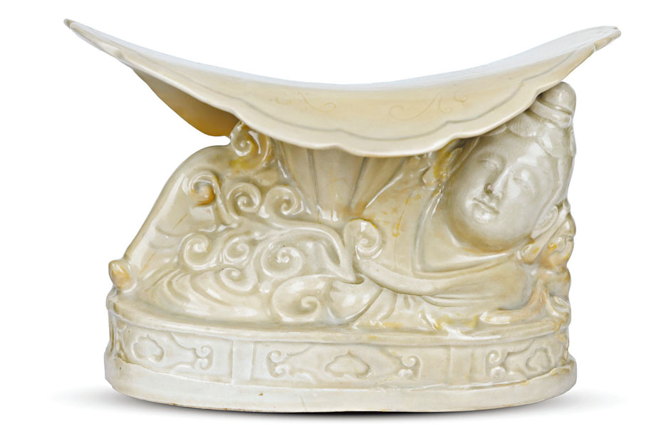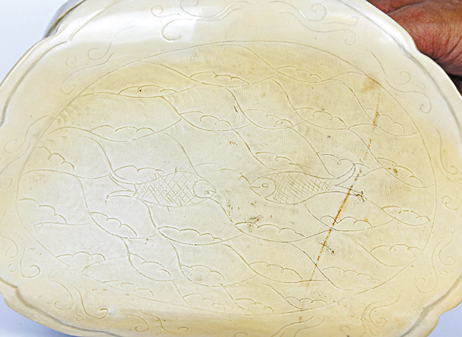 在幾種常見的胎裝飾工藝中,劃花出現時間較早,始於唐代,指在尚未乾透的瓷胎表面用竹、木、鐵等工具,淺淺地描劃出線條狀花紋,然後施釉或直接入窯焙燒。靈動、纖細的線條操作要求相對簡便,筆者收藏的「宋定窯白釉仕女枕」枕面便刻劃海水魚紋,其紋飾淡得若隱若現。