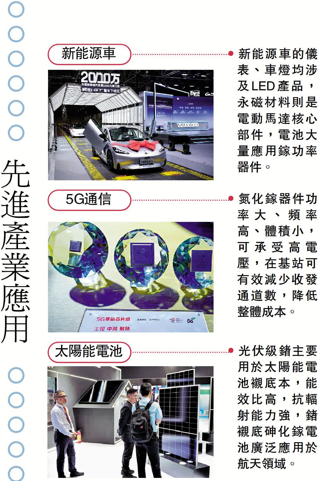 中國是全球鎵、鍺這兩種材料的最大出產國,產量均佔全球產量的大部分。鎵和鍺是構成半導體的重要材料,也是芯片製造的關鍵元素。其中氮化鎵化合物可用於手機、電腦的LED顯示屏,也廣泛用於照明、電源、通信等領域。而鍺主要用於光纖通信、夜視鏡和衛星上的太陽能電池。此外,硅鍺還是一種重要的半導體應變材料,可大大提高晶體管的速度,在高速芯片中有着廣泛應用。