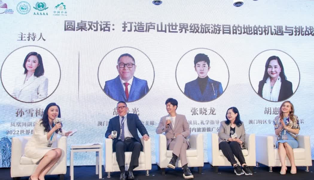 推介會現場,鳳凰網副總編輯、2022世界經濟論壇「全球青年領袖」孫雪梅,澳門特區旅遊業議會主席胡景光,演員、禮學指導、中國藝術研究院教授、文化旅遊部旅遊推薦官張曉龍,澳門特區專業導遊協會會長鬍惠芳,三語主持人、清華大學全球傳播使者蘇小小共同開啟了「打造廬山世界級旅遊目的地的機遇與挑戰」圓桌對話,各位嘉賓高度讚賞廬山經驗,並分別從豐富「廬山天下悠」品牌內涵、擴大品牌帶動輻射範圍、打造多元業態及情景體驗產品、進一步提升航線、高鐵便利等角度,為廬山出謀劃策。