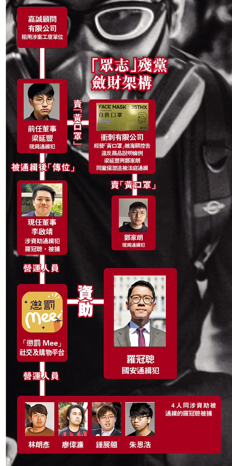 據了解,被捕的前「眾志」5名頭目和骨幹,在網購平台「懲罰Mee」扮演統籌、營銷和聯絡等角色,其中綽號「阿包」的鍾展翹,曾為「學民思潮」常委、網媒《破折號》總編輯,參與過「反國教」及黑暴;廖偉濂是上水圍原居民,和朱恩浩在2019年黑暴期間均為擺街站煽暴的積極分子,兩人其後在「7·14」沙田暴動期間涉非法集結被捕;「眾志」成員李啟靖曾出任浸會大學學生會社會政策學會幹事長。