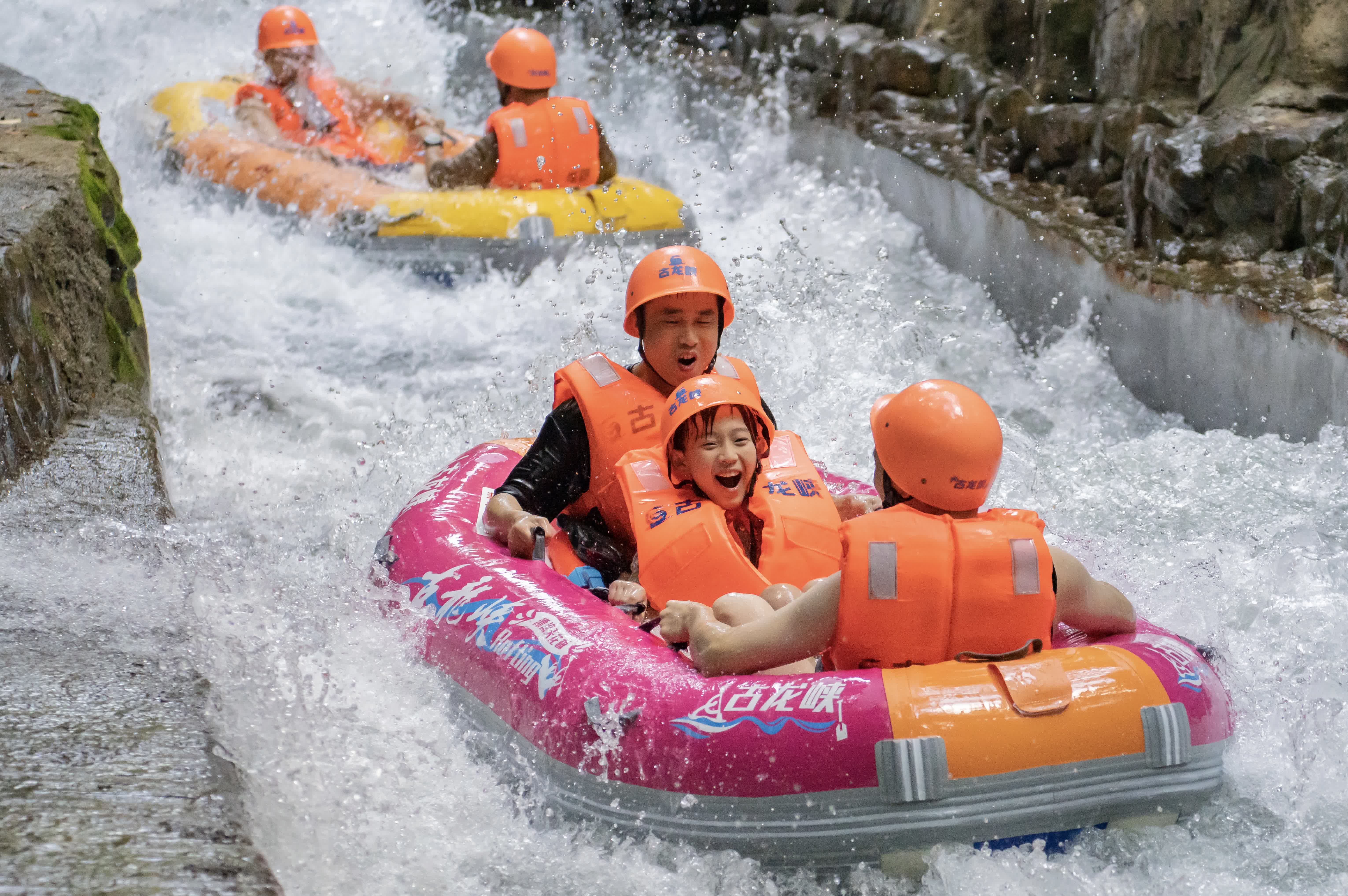 適逢高溫暑假,郊外避暑清涼游成為熱門。遊客可以在古龍峽長6063米、落差高達378米的國際漂流賽場上與浪共舞,乘坐漂流艇在原始叢林中激情馳騁;也可漫步於水霧繚繞的峽谷棧道飽吸鮮氧,或步入雲天玻霸,漫步雲端美景中。近兩天周末便接待遊客總數突破2.8萬人次,同比大增近3.4倍。
