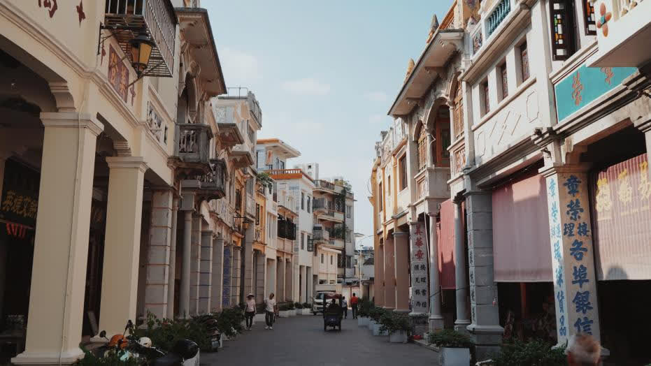 漫步在古色古香的斗門舊街,高挑的騎樓、顯眼的商鋪牌匾,泛黃的外牆雕刻着繁複花紋,還有門廳上懸掛着精緻的歐式壁燈......傳統的嶺南情調與獨特的西洋建築風格高度融合,恍惚間好似穿越回民國時期的繁華盛景。