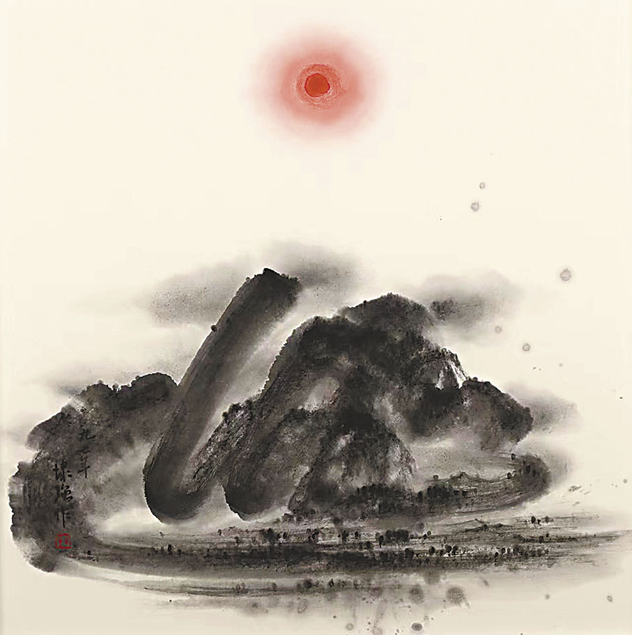 《心畫》系列為靳埭強於上世紀九十年代,與日本著名平面設計師田中一光在奈良舉辦的設計雙人展而創作的一組水墨畫作。作品基於「畫自我心」的創作理念,由上半部分中間位置的紅色圓點和下半部分的水墨線條組成,其餘部分則是大面積的留白。紅色圓點看似簡潔,近觀才會發現其層次的豐富,經藝術家層層渲染的處理,紅顏色從內至外呈現出由濃重到清淡的轉變;下半部分的水墨線條作為畫面的主導,是用粗狂的書法線條呈現的山丘形體,雖然僅寥寥數筆,但水墨的濃淡深淺錯落有致,山丘的形態加之周邊水氣雲煙的細節,頃刻盡在畫中;特別是四周大面積的空虛餘白,不僅使畫作色彩對比更突出,也使畫作言簡意賅,增添禪味禪意。