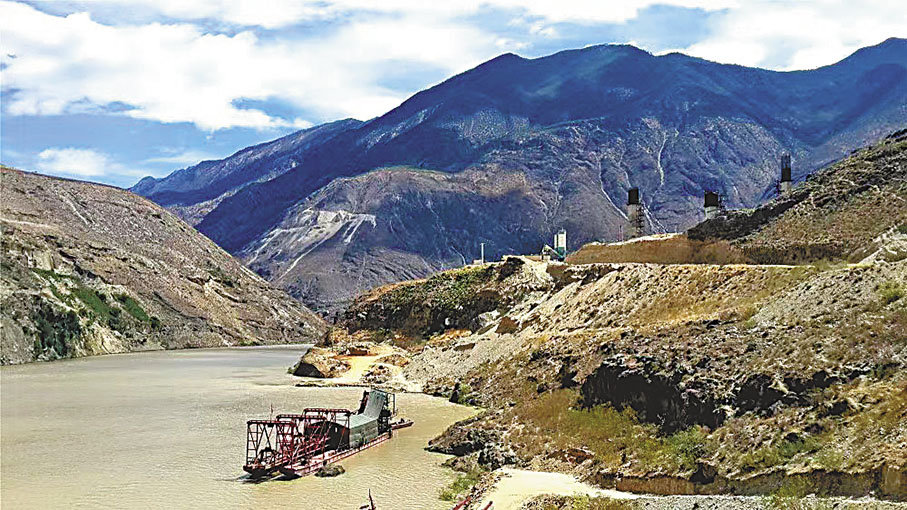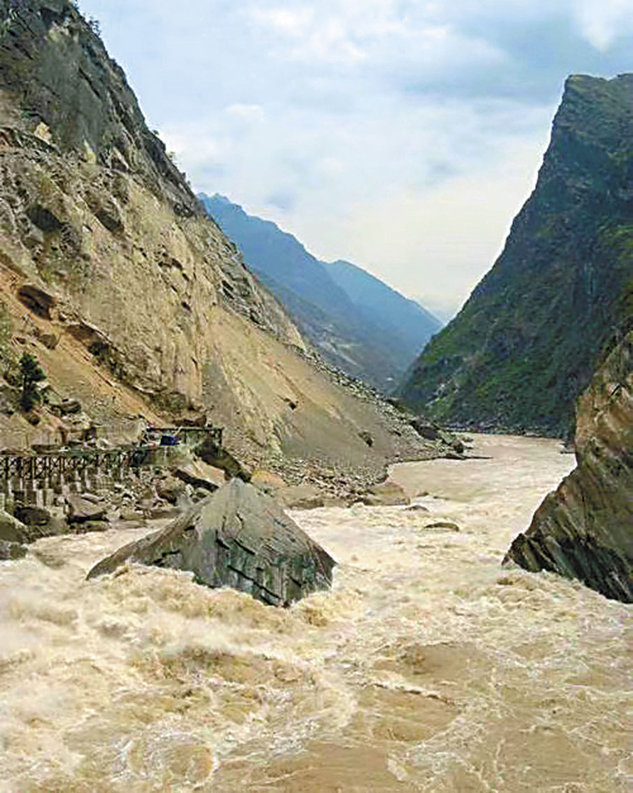 兩側峭壁岩石為片岩和大理岩。被擠壓、撕碎的山石裸露着傷口。由於山岩的斷層塌陷,造成無數石樑跌坎,加之兩岸山坡陡峻,岩石壁立,山石風化,常有山崩巨石滾落谷底江中,形成礁石林立,犬牙交錯,險灘密布。致使江流湍急,瞬息萬變。不少段落的流速達每秒6至8米。急流像斬關奪隘的猛虎,氣壯山河,勢不可擋。奔騰氣勢之浩蕩,「洶湧澎湃」已難以貼切其壯美。或漩渦漫捲,飛瀑轟鳴,聲震山谷,驚心動魄。或狂馳怒號,石亂水激,霧氣空濛。撞碎的浪花閃現出七色的彩虹。枯水期水深4至5米,豐水期水深9至10米。在約20公里長的峽谷中,有險灘21處,高達10多米的跌坎7處,江流連續下跌7個陡坎,短距離中就有216米落差,平均每公里14米。水勢洶湧,聲聞數里。當地老人稱,在古代,虎跳峽地區曾是人不能靠近,鳥不敢迴翔的地方。虎跳峽天下險,但「險」中蘊藏着奪人心魄的壯美,吸引了無數勇敢者到此尋勝探險。上世紀三十年代,美國著名人類學家洛克曾三次遊歷虎跳峽,並租用飛機從空中拍攝照片,獲得大量資料,使虎跳峽聞名於世。