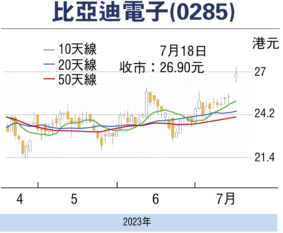 比亞迪電子(0285)剛發盈喜,預計上半年純利將按年升1.15倍至1.46倍,次季純利可達9.04億(人民幣,下同)至11億元,相當於期內按年增長99%至1.42倍,遠高於市場預期,其於去年同期純利為6.33億元。集團期內股東純利急升,受惠於主要客戶份額提升,產品和客戶結構優化,帶動旗下新能源汽車及智能產品等新興業務增長,規模提升改善產能使用率,促使實現盈利大幅改善。