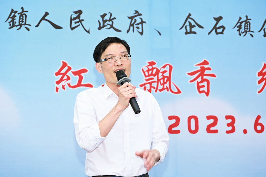 企石鎮人大主席盛斌林代表企石鎮黨委、政府對各位香港同胞和嘉賓的到來表示熱烈歡迎。他致辭時表示,東莞與香港人緣相親、血脈相連,莞港一家親。一直以來,企石鎮黨委、政府高度重視與香港的合作,不斷加強與香港在經貿、旅遊、文化、人文交流等多方面的緊密聯繫,推動兩地優勢互補,共同蓬勃發展。近年來,在市委、市政府的正確指導下,在廣大居港鄉親以及社會各界的關心支持下,依託得天獨厚的生態人文土地資源,借助松山湖國家級平台的金字招牌,以及兩大戰略性新興產業基地建設機遇,企石經濟社會發展保持良好發展態勢。同時,企石鎮積極發揮社團作用,組織開展多形式聯誼交流活動。在粵港澳大灣區建設的強力驅動下,東莞乃至企石正迎來新一輪的投資黃金期。希望以此次活動為契機,號召廣大香港同胞緊抓機遇融入大灣區建設,為東莞和企石的經濟社會高品質發展注入新動能,不斷譜寫兩地發展新篇章。